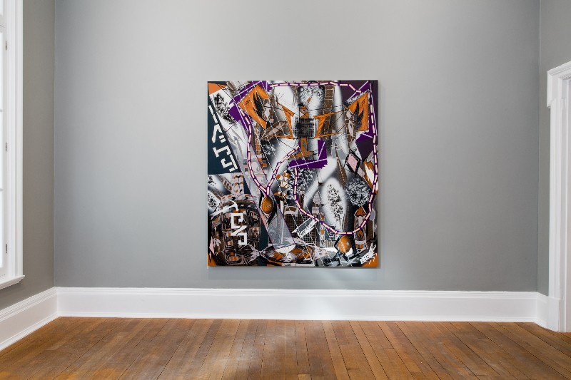 This exhibition is split between smaller monochromatic parts and much larger and explosively powerful canvases. His larger paintings have a rigid flatness that co-exists with a seemingly unrestrained profusion of layers and details; each one features a different primary colour scheme to distinguish it, be it lime/yellow, orange/blue or purple/ochre. These artworks are inherently difficult to channel with written words, due to their lack of an obvious focus within the fracas of shapes and fonts that have been seemingly twisted and contorted by the artist into temporary submission. It’s easy to imagine them unfreezing as soon as you turn your back. And indeed, Pittman’s recurring pasting of saws and hammers links free-association ideas to the reality of the hard grind that the artist must face to maintain any semblance of control over his frame under the restless cascade of the subconscious.