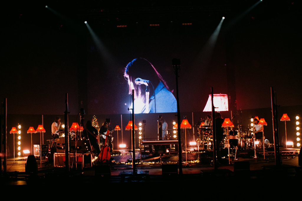Blossoms’ gig, live at Brixton Academy via Melody VR, opens with the pale yellow glow of Christmas lights. There are lamps bordering the stage, and the word “love” adorns the keyboard. Soft strums on guitar welcome the first song, Blown Rose. The acoustic greeting is mellow, perfectly fitting the stage arrangement. The setlist is littered with love of all forms – sometimes childish and stubborn, others lonely and desperate.