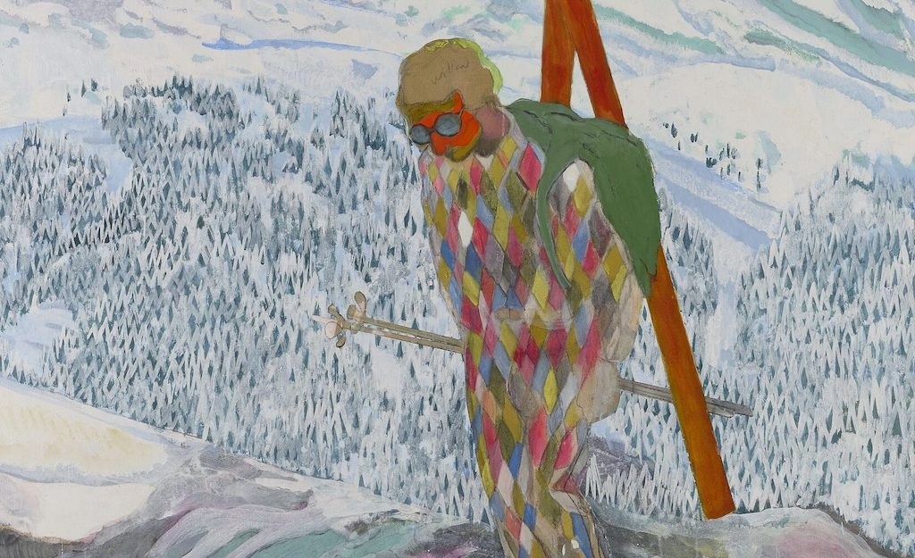 Entering the second room, one finds the monumental Bather (2019-23). Apparently based on a 1942 photograph of actor Robert Mitchum, and reminiscent of Cézanne, it depicts a young man standing dressed for summer in front of a decidedly cold-looking seascape, a characteristic act of dislocation by Doig. Another vast canvas, Alpinist (2019-22) sees the painter – a lifelong skier after childhood years in Canada – highlighting the majestic beauty and danger pervading the snow-covered landscape. The intrepid figure, clad in the costume of a harlequin, channels Picasso’s symbolic usage of the character as an artistic outsider.