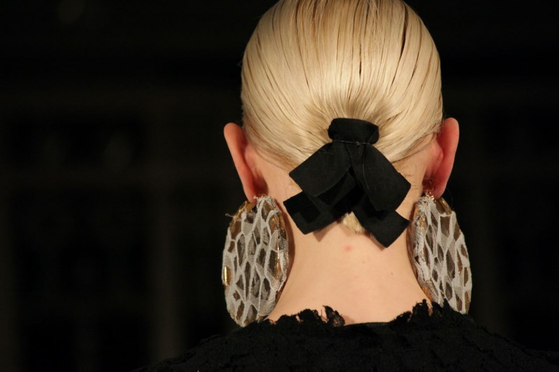 Using the shapes from basketball jerseys and mixing them with a ‘studio 54’ feel, Raffaele has managed to use inspirational women from his life experiences. Makeup by the Body Shop featured streaks of red eye shadow around the eyes and glossy red lipstick. Hair by Toni & Guy complimented the tones with slick centre lines and looped ponytails complete with black hair ties. The collection saw layers of flared trousers and halter-necks, sheer black overlays and lace detailing. Long shapes took form throughout the whole collection as well as a sporty element being added through huge hooped earrings. Additional accessories in the form of bags were a stand out point for the collection, with one particular design featuring what looked like a rug, shaped perfectly into an oversized clutch, with of course tassel extras. Blacks and red prevailed the whole collection but splashes of sky blue and beige broke up and added extra sophistication to the garments.