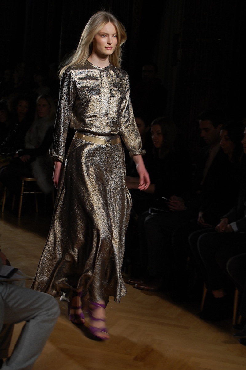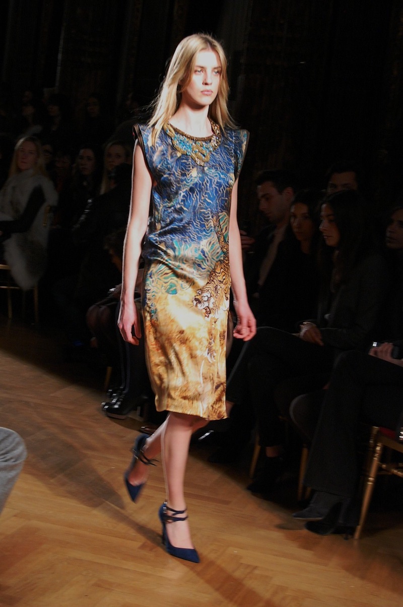 A delicate upsurge of metallic colours followed presenting a dazzling gold jumpsuit which captured centre stage as well as an oriental inspired piece with dragon imagery embroidered beautifully on to the final pieces in the show.