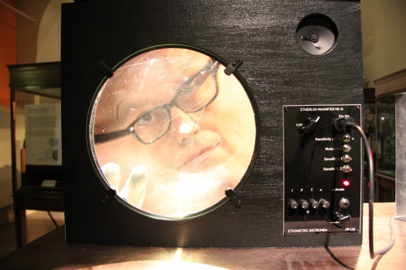 All are still and silent, until Dr Kounadea introduces the museum’s resident ethometric expert, Ray Lee. Lee appears quietly in a simple woollen suit, brown shoes, and white gloves, and without saying a word begins to touch the diverse equipment into life. The audience either mills around him, watching as he turns knobs and flicks switches, or wanders off to peer at some particularly odd-looking entity. Gradually, the room fills with noise. A unique auditory journey has been initiated, and you’re carried through a textured sound forest of interweaving whirrs, groans, beeps, creaks, warbles, thrums, fizzes and beat-like buzzes.