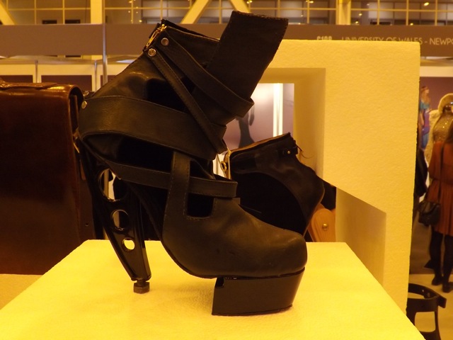 We were not disappointed; the UK is clearly a hotbed of young talent. Two exceptional shoe design discoveries came from De Montfort University. Janina Alleyne’s “Exoskeleton” shoe collection is visually stunning. 3-D printed and modelled to her designs by “Inner-Leaf”; imagine slipping your foot into the skull of a dragon hatchling and you get the picture. Her fellow student Kimberly North is another talented young shoe designer who has created some amazing architecturally inspired footwear.
