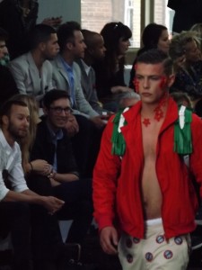 Shannon sent down the catwalk models bedecked in fringed shorts, his trademark panelled shirts and jackets and plenty of slashing alongside more traditional looks of tailored knee length shorts paired with crisp shirting. A particular standout look was a bright red jacket worn open by a bare-chested back satchel (part of the designers collaboration with Cambridge Satchel Company) sporting model, teamed with polka badged khaki shorts.