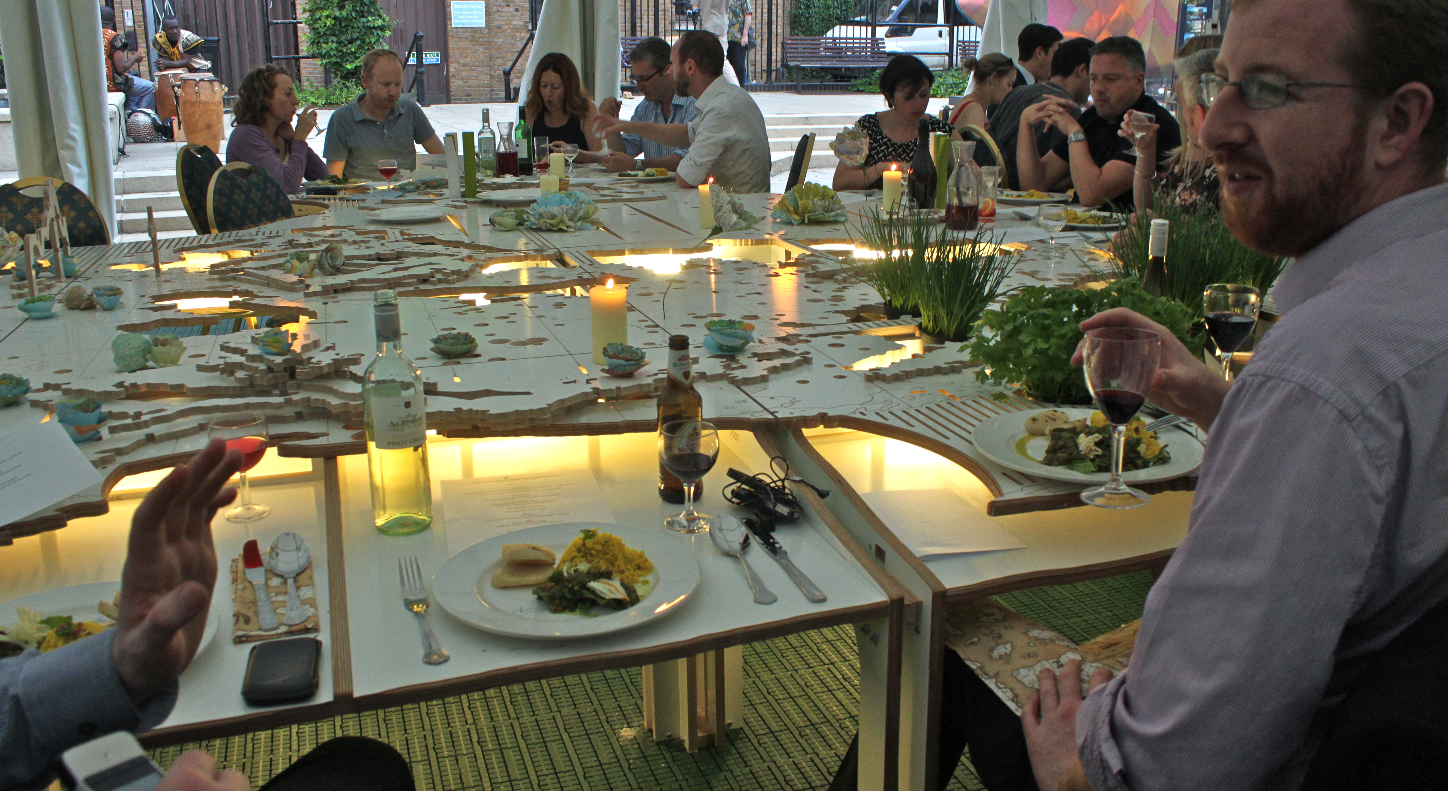 Keeping with the global theme, one of the quirky highlights of this event is the dining area known as Worldscape, design by Atmos, the art and architecture studio founded by Alex Haw.  Each night, guests sit round a giant sculptural model of the world – 15-metres long, 6-metres wide and over 2-metres tall, and dine of its coastlines with a bespoke set of plates illustrating their location in the world.