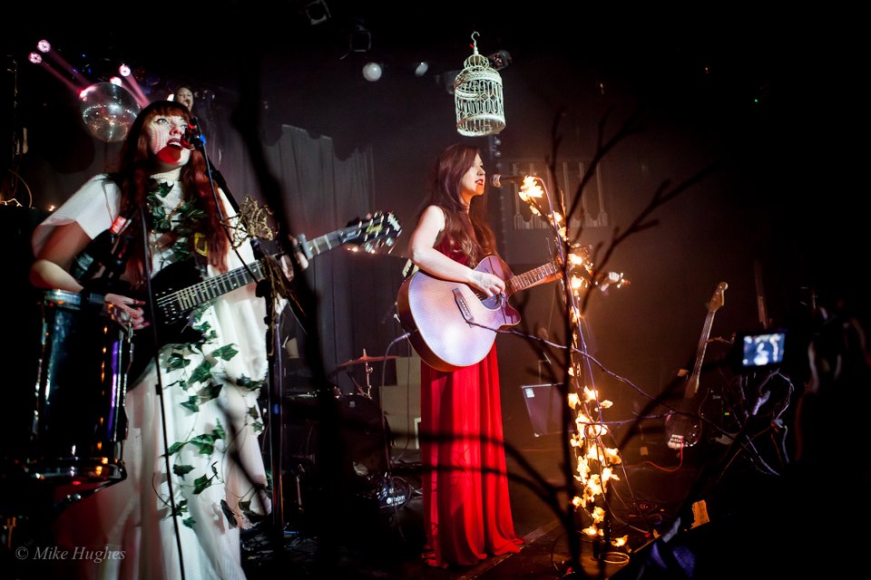 The Kazimier looks different as Bird play tracks from their new EP, Shadows. The stage is hemmed with twiggy branches stretching skeletal fingers to the ceiling. Old lamps with crooked shades glow from the back of the venue and two white birdcages hang ghostly in mid-air.