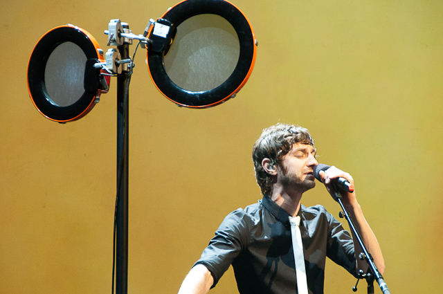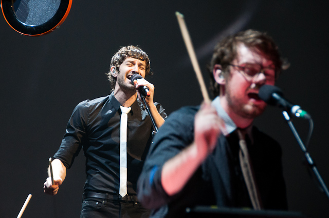 Opening the show on a raised platform behind the rest of the band with The Only Way from the 2006 album Like Drawing Blood, it quickly became clear that Gotye really likes to hit things. And he’s really good at it. An accomplished drummer, if he’s not hitting synth pads, he’s filling in on a second set of drums, hitting the bass player’s strings with drumsticks, clicking, clapping, and generally driving the percussive theme of his tracks and playing lead drums on some too.