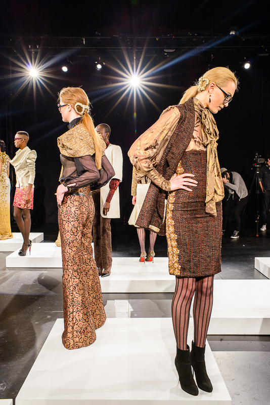 While Tlale’s more casual looks would surely befit any stylish, working woman on-the-go, it’s his evening wear that makes the most lasting impression. Three dresses in particular stood out above the rest. The first was a strapless scarlet and black number that was fitted from the bodice through the knee, and flared out into a brilliant circle of black tulle. The second, was a gown made of light pink, body hugging lace with long sleeves that similarly transformed into layers of cascading tulle towards the bottom. Only this time, the hue a more saturated pink and the tulle more voluminous. Finally, an ombré dress of ivory fading into gold, patterned with shining vines and flowers. Atop the dress, a sleeveless bolero jacket was fully embellished and revelled in its opulence.