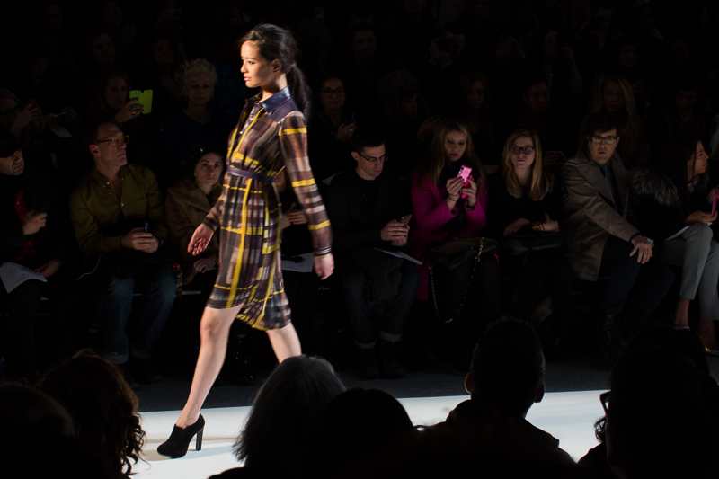 Gone were the breezy, ultra-feminine looks of the Emerson spring collection, and present were sleeker, more uniformed designs wholly appropriate for the A/W season. Purple, yellow and black—with hints of red—ruled the runway. Tartan fabric consisting of combinations of these colours was used in dresses, skirts, blouses, and jackets—basically everything but pants. Plenty of leather, sheer and sequined elements assured that the multiple all-black looks were anything but boring. In fact, many of the monochromatic pieces tended to be most interesting and worthy of high intrigue.