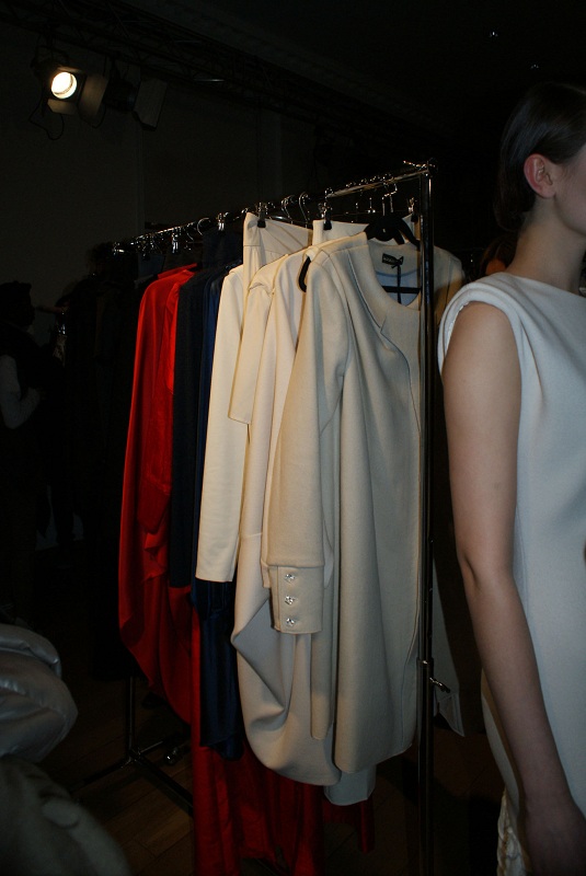 The next collection we saw was Basharatyan V, run by Balkarian-Armenian born Veronica Basharatyan. Veronica moved o London to enrol on a course at Central Saint Martins, and later graduated from London College of Fashion. The brand’s aims are to “create unique fashion fabrics and individually tailored women’s clothing”, and having opened their first showroom in Moscow, they are now working on opening the second here in London. The A/W collection, Broken Angel, consisted of four simple colours – black, white and cream, navy and red, giving an almost patriotic feel, however Veronica expressed that her she was inspired by Japan – kimono techniques and deep shades of red indicate Geisha girls being the muses for this collection. The other highlights of the collection were an off white wool coat with beautifully cut lapels, and turtle necks, along with a navy silk dress complete with striking ruffles on the chest.