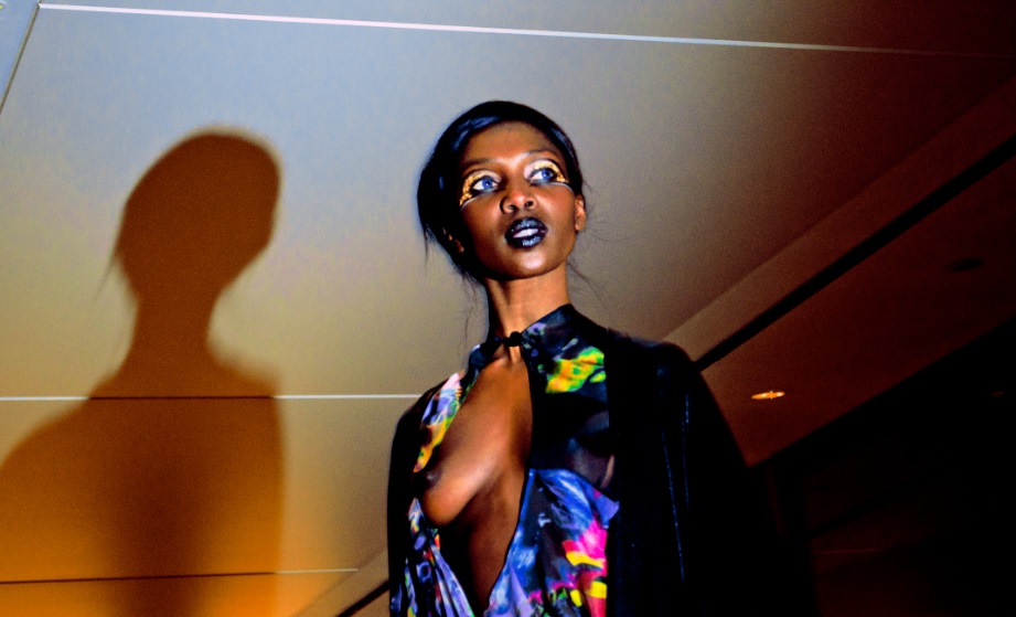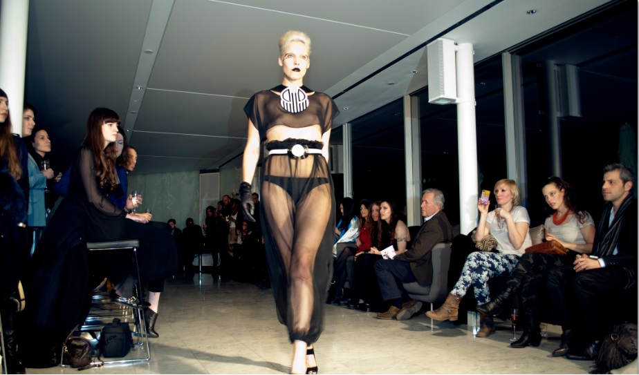 The first three models walked in on Pointe, with black ballet shoes and leotards. Each leotard bore a different motif of beautiful art, with white fringe on the shoulders of the garments. Every model wore black lipstick, with gold eyes and a small back beehive and we started to understand designer Mayka Finkelstein Amrami’s vision of art incorporated into fashion.