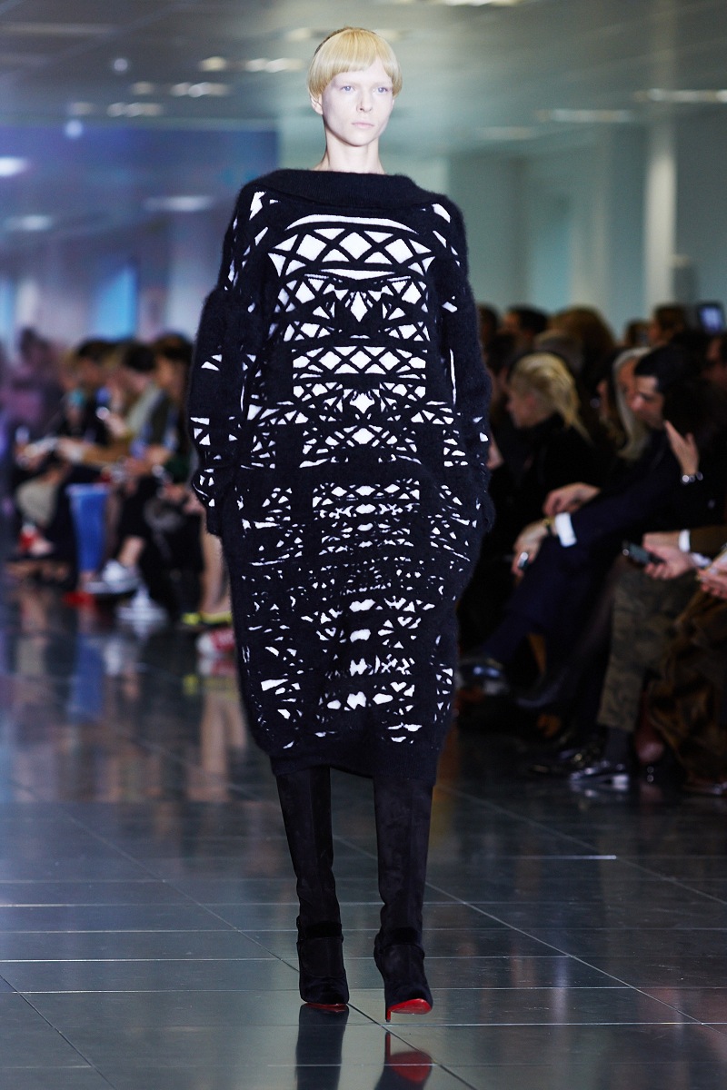 With an Eastern influence in pattern and shape (there were numerous origami folds and pleats on many of her dresses), the colour palette was cool and subdued, featuring silvers, greys and midnight blues amongst designs of cherry-blossom trees, bridges, moons and waterfalls. Also perfecting the wet look and black-on-black statement, Katrantzou combined an embossed leather skirt and a long, slouchy jumper. With sweeping hemlines and dazzling necklines, the collection was uniquely beautiful as well as compellingly feminine.