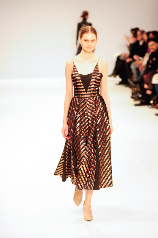 Iuliia Paskal founded her brand in 2010 and has used her experience as an architect to bring a new and interesting twist to the fashion world. Inspiration for AW13 came from a whole array of wonderful things, such as classic music to personal reflections of life. Bold metallic colours were used alongside a more basic monochrome palette in order to create perfect balance between retro and futuristic.