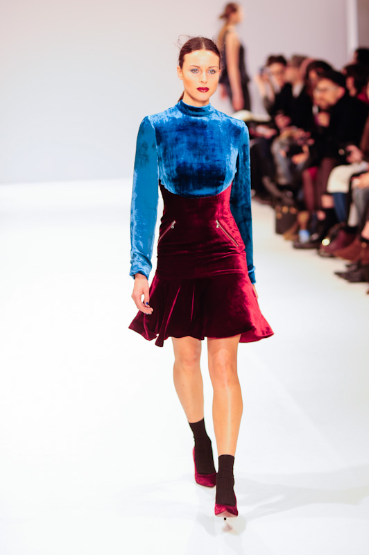 Yasya Minochkina was next on the bill. She studied in London at Central St. Martins, and her design creativity is a true reflection of where she studied. Peplums prevailed her collection with a host of burgendy and blue colouring velvet coats and dresses.