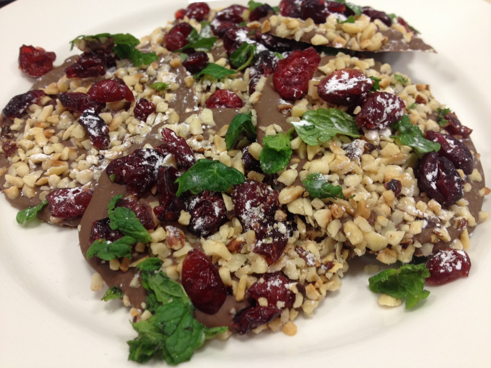 - Top the melted chocolate with the nuts, dried fruit and fresh mint leaves, and dust with icing sugar.