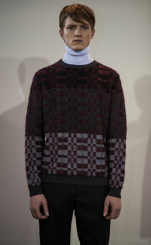 As expected, Pringle delivered on a solid showcase of outerwear, cashmeres and knits. Silhouettes were kept classic, letting the textures and techniques to do all the talking. Cashmeres and velvets were paired with cellophane and neoprene, while embossed and hand-knitted argyle put a modern twist on some of our favourite signature prints. The featured mesh motif was prominent throughout this season at LC: M, but for Pringle it felt reminiscent of their S/S 2013 women’s wear collections. The palette was neutral, with deep indigos and ruby reds used for contrast.