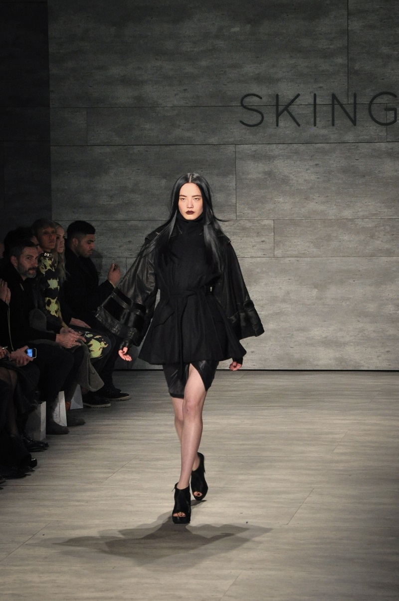 For Skingraft’s autumn/winter 2014 collection, a dark attitude was the prominent mood of each look. A combination of women’s and men’s clothes, every outfit had layers of jackets, hats, scarves and even some handbags.