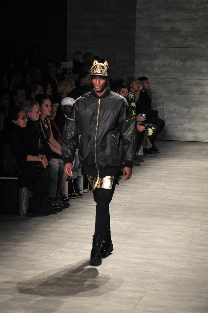 Track jackets were popular garments among the men’s clothes, while large coats nipped in at the waist with belts were a common thread though the women’s. The colour palette largely consisted of various shades of black, some tinted with a little more burgundy, some with a shine of forest green; other pops of colour were in a quilted gold lamé and a printed blue satin. At times there were overwhelming gothic influences, and other times hip-hop culture inspirations. These two clothing styles combined, made an interesting mix of attitude and urban.
