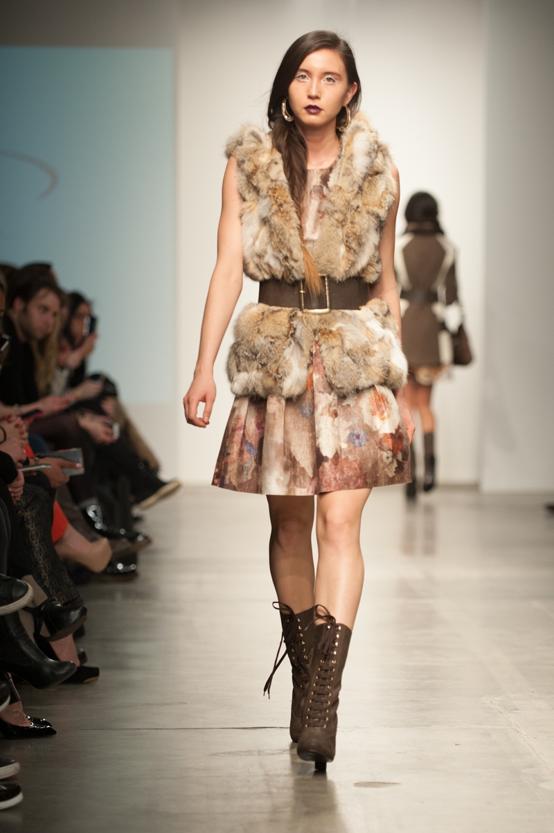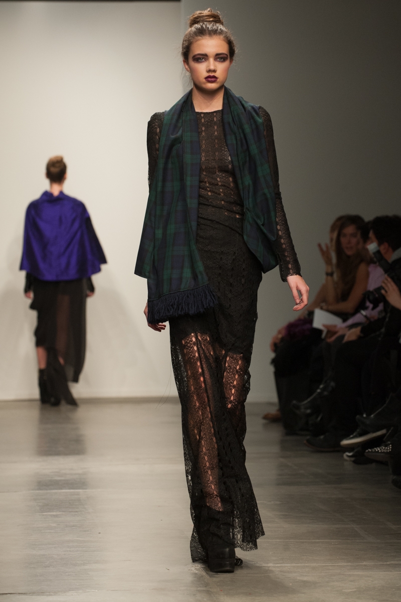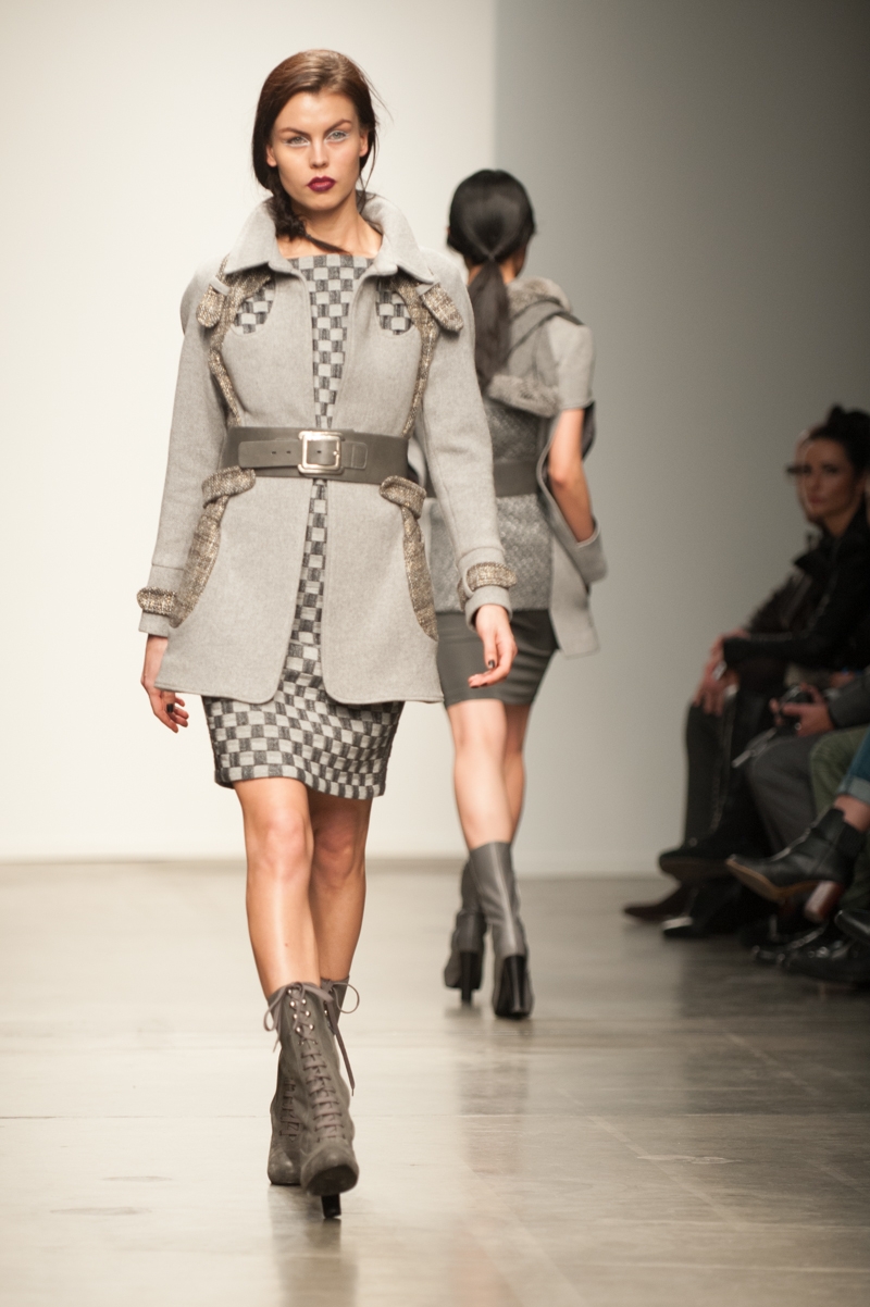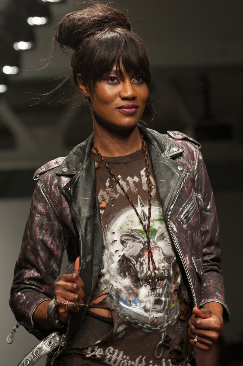 Our favourite designer of the night was American Christian Benner with his collection of leather jackets and t-shirts. He gives vintage pieces new life (and adds on a stonking price tag) by renovating pieces with punk traits: graffiti, rips, ladders, studs and spikes galore. Every single item that got stamped up and down the runway at Pier 59 Studios was mouth-wateringly cool, and acted as a real salute to Brit punk fashion. Despite our reservations about his title of designer, as he does what many do of their own accord in their own homes, we have to commend him for the slight “f**k you” message given to those who wouldn’t dare wear anything too last season. Recycled fashion is the future, and if the standing ovation was anything to go by, many at the show tonight would have agreed!