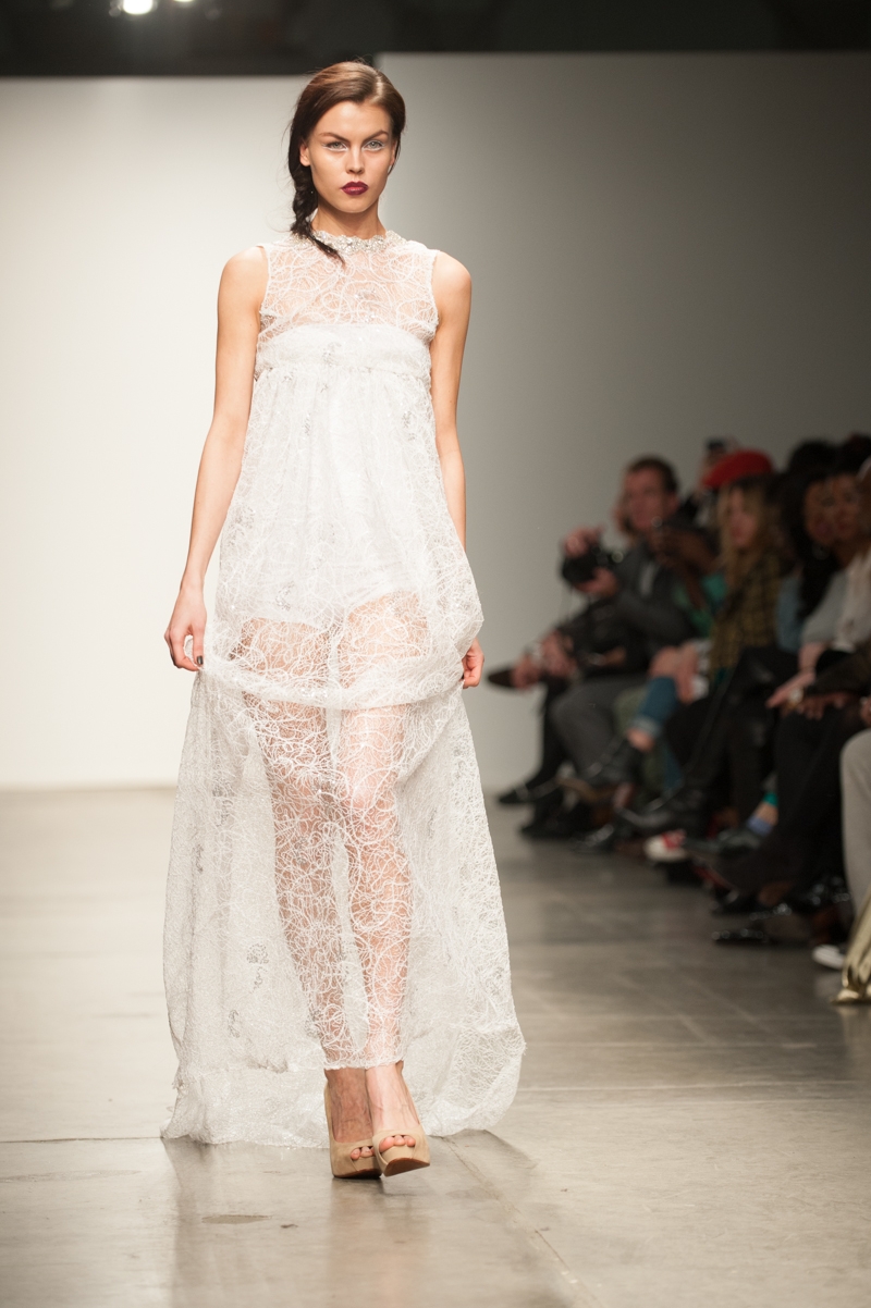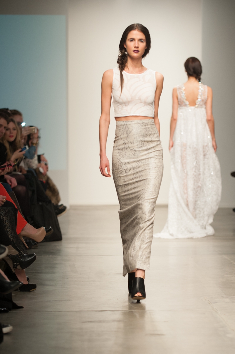 Amy Devan’s brand Naveda presented a beautiful array of elegant pieces with an ethnic and bohemian twist. The collection comprised of mostly blacks, whites and golds, was a naturally winning combination. The range of figure-hugging fabrics ranged from heavy and sensual velvet dresses to ebbing and flowing sheer pieces, all decorated with gold statement beading. Our favourites were the velvet piece with a sultry plunging neckline and a white maxi dress with neck, chest and shoulders adorned with gold. Exceedingly elegant and versatile.