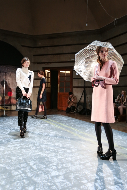 It was all about the coats, as trench coats and swing coats filled the floor broken up by a range of colours from pinkish pastels, baby blues to navy blues and browns. Props such as newspapers were featured in an attempt to keep the invisible rain from models’ heads. Large clear polka dot printed umbrellas accessorised outfits and models paced the floor in an act of impatience. One beauty took a seat on the bench whilst her legs fidgeted; she stood up again to pace once more. It was an intriguing presentation, which captivated the audiences and the atmosphere was enhanced when a singer took to the floor to sing a rendition of singing in the rain.