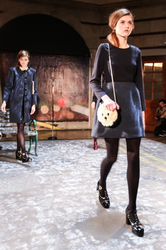 The saying “it’s raining cats and dogs” rang true as cat prints were heavily featured throughout the presentation – on a cream sweater, a pretty navy dress with cream coloured colour and button panel, and a suit. An adorable black puppy also accessorised a model garbed in a grey coat, white tights and ox blood Mary Janes. The canine theme was noted again in an endearing dog-faced handbag.
