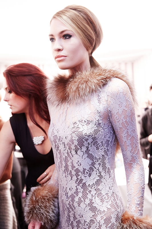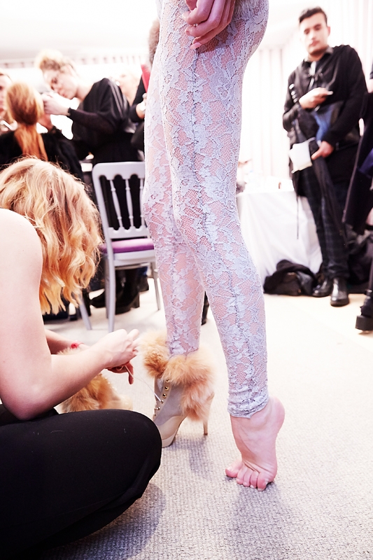 We were lucky enough to go backstage at the PPQ show, frantic PR’s, photographers swarming around half-dressed models taking “behind-the-scenes” images, sets the scene well. The hair and make-up was very 60s-inspired: winged eye-liner, big hair tied with a scarf with natural make-up.