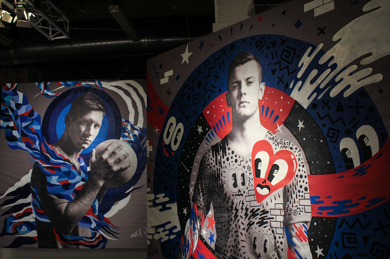 In six unique works the artists work upon 10ft x 10ft canvas prints of Danny Clinch’s black and white portraits of Leo Messi, Robin van Persie, Jack Wilshere, David Luiz, Sergio Aguero and Sergio Ramos. Six emerging artists collaborate on the impressive works, all executed in Pespi’s trademark red, white and blue, yet each conveying its own unique style.