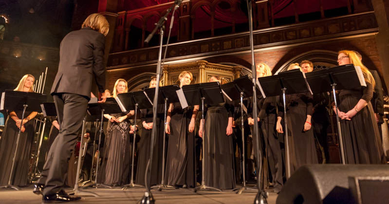 Brit award-nominated singer Laura Mvula was the first guest to join him onstage, performing with the choir three songs – including the stand-out Green Garden – enthused with hypnotic tribal beats accentuated by Laura’s soulful lead vocals. Musician Ksenija Sidorova followed, whose skill on the accordian impressed Whitacre (as well as the audience) enough to warrant the praise from the conductor as having made it a “cool” instrument to play. She played solo for a while before accompanying the choir in the beautifully sombre Stopping by Woods on a Snowy Evening – a Robert Frost poem put to music by Whitacre.