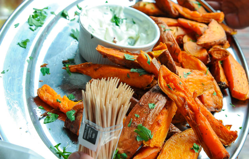 In proper English pub fashion, there is an extensive and well-stocked bar offering a range of specialty lagers, craft beers and special “ales of the day”, as well as interesting wines comprised of old and new world wineries, and fun seasonal cocktails. However, sometimes the occasion (or weather) calls for a Pimm’s, and theirs was perfectly mixed with a muddle of fresh fruit. The canapés served highlighted their new menu and gave a clear representation of the unpretentious food on offer. First to be sent out were the Jersey Royals with tomato and asparagus, with a light Hollandaise-like dressing; very pretty to look at but disappointing in taste and rather under-seasoned. Next came the crowd pleasing bacon-wrapped sausages with brown sauce, which were simple and tasty, and the tempura cauliflower, which, with its spicy crème fraîche was unexpectedly delicious. The sweet potato wedges with tarragon mayo had a good roasted flavour, however were slightly awkward to eat due to the shape and texture. The fish goujon, while tasty, seemed a little conceptually confused served bruschetta-style, but the ‘mushy pea’ element on the bread managed to steal the show with its punchy flavour.