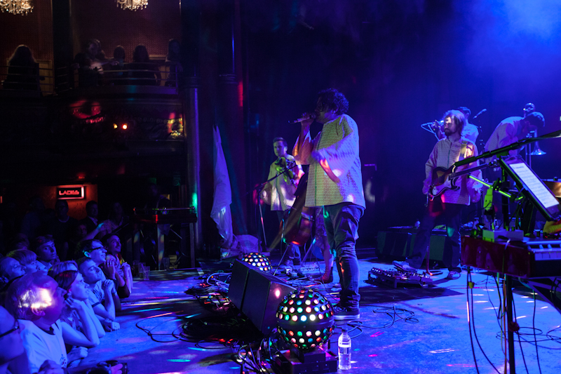 Upon arrival at the famous venue it was crystal clear to see that there is drunken joy in the air: everyone seemed to have a beer in hand and balloons were bopping all around the crowd. A narrow curtain was stretched across the front of the stage, adding to the tipsy anticipation. After a brief introduction from a town crier (we don’t know why either), the words “WE ALL WIN TONITE” were graffitied onto the other side. The curtain eventually dropped to reveal the band in full 60s attire and the audience were greeted with a burst of joyous noise as the set kicked off with a rapturous bang.