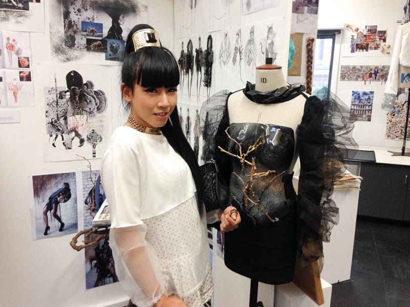 “For the garment, I wanted the coat to look quite androgynous. There are some parts of the coat that are ruffled, and I made every single piece by hand and stitched it on. I wanted to represent what a crime scene would look like; you have blood everywhere. I bought red fabric paint and smothered the garment with my hands for a messy, uncalculated look.”