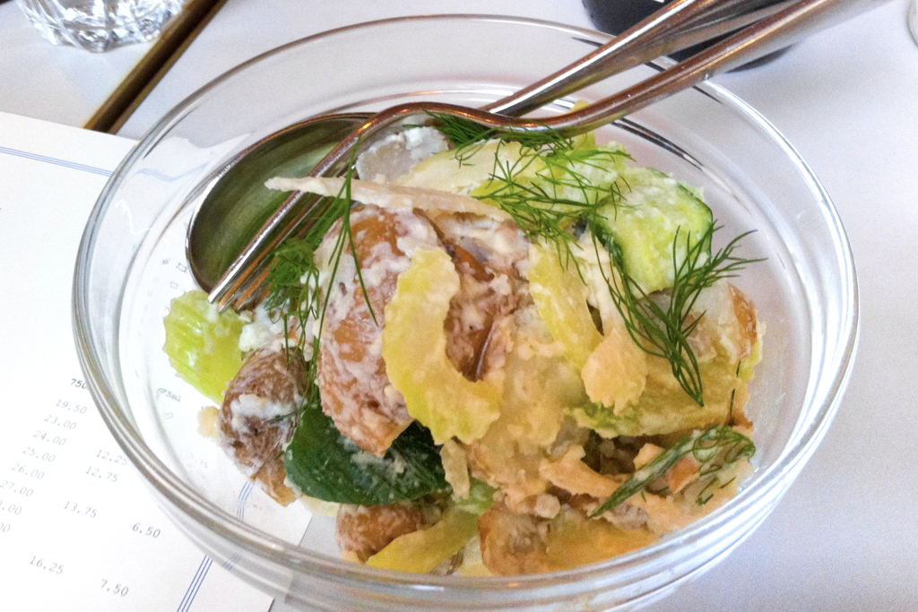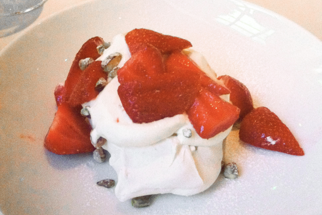 A main course of Parmesan Crumbed Chicken Schnitzel, Creamed Corn & Fennel Slaw is tender and comforting, with a citrus-fresh edge. The slaw is sharp, perfectly cutting through the crumbed meat. The corn falls short of the mark, though – school dinner-like and overwhelming. The chargrilled lemon accompaniment is a thoughtful touch for an added dimension. A side of northern European-inspired New Potato, Crème Fraiche & Dill is cold, creamy and delectable, gentle with dill and celery – the ideal match. The main course overall needs a touch more seasoning, but it’s hardly a fault. A taste of Sticky Chilli Belly Pork, Spring Onion Salad is soft and moreish, with a strong sense of rich Korean flavours, balanced perfectly with the sharp onion.