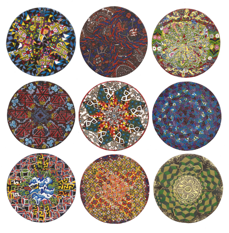 Sarah Jacobs’ works seem to follow in a similar vein; they are a series of wooden circles, 10cm in diameter and painted with bold geometric patterns in bright colours. However they don’t carry off the use of garishly clashing colours as well as Rodrigues’ work does as they feel precious and calculated rather than playful and bold. The circles feature iconography from her youth in rural Pennsylvania; a Catholic Church window, a quilt pattern, the Veterans of Foreign Wars logo and a hex sign are all built into the patterns, yet their significance is questionable when the works feel methodical and devoid of any emotion.