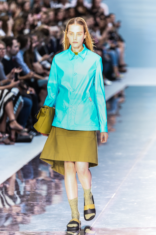 The brand best known for its classical wellington boots showcased an extravagant collection with a video backdrop that captured the audience’s attention. As the models revealed Hunter Original’s designs the grande screen behind them displayed an underwater world with floating submarines and animated sharks. Hunter Original stuck to a strong theme and celebrated British Summer in style. Models sported military khaki parker coats with flamboyant yellow and blue pockets, over-sized shorts and of course the brands signature wellington boots which were worn by both male and female models.