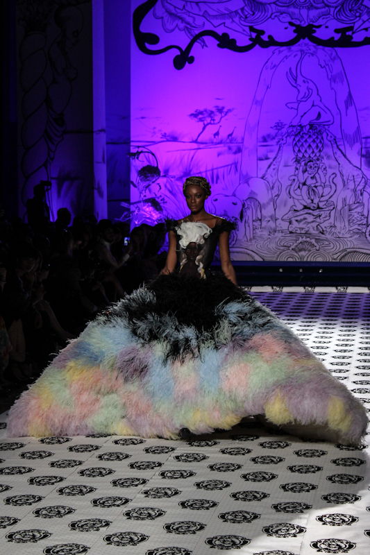 Sorapol presented a African culture x French Rennaisance inspired spring/summer 2015 collection at the Royal College of Surgeons for London Fashion Week. The new looks are ostrich feathered skirts, plenty of gold and African inspired prints. Here are our images from the show.