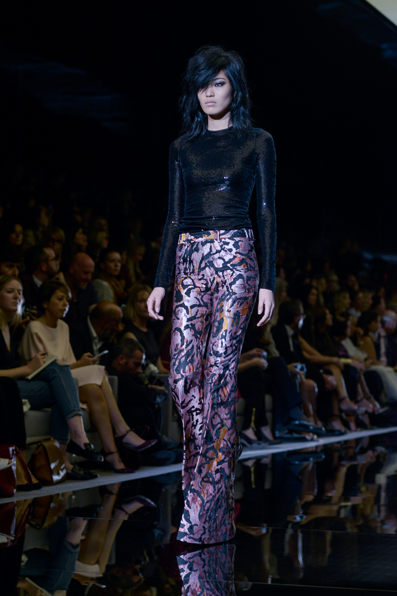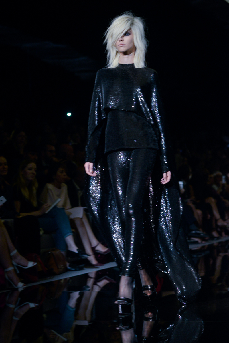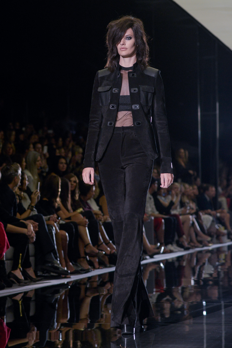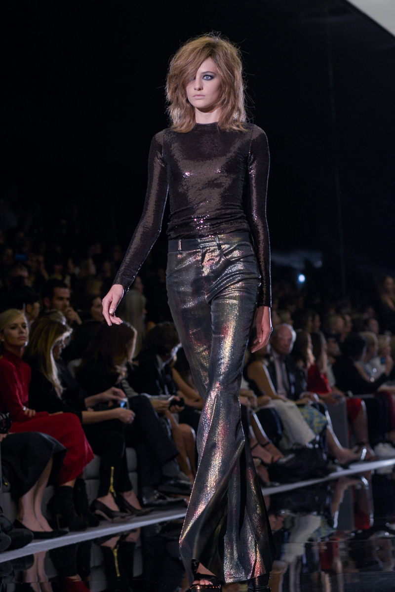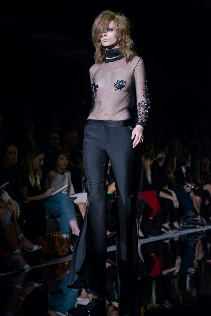 Tom Ford presented yet another thrilling, show-stopping and provocative spring/summer 2015 collection at Vincent Square for the London Fashion Week. The new looks consisted of trouser flares made from suede and leather, sequin filled garments, leopard print, and sheer fabrics with black bold panelling.