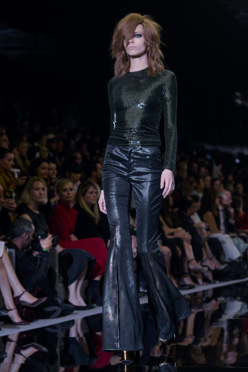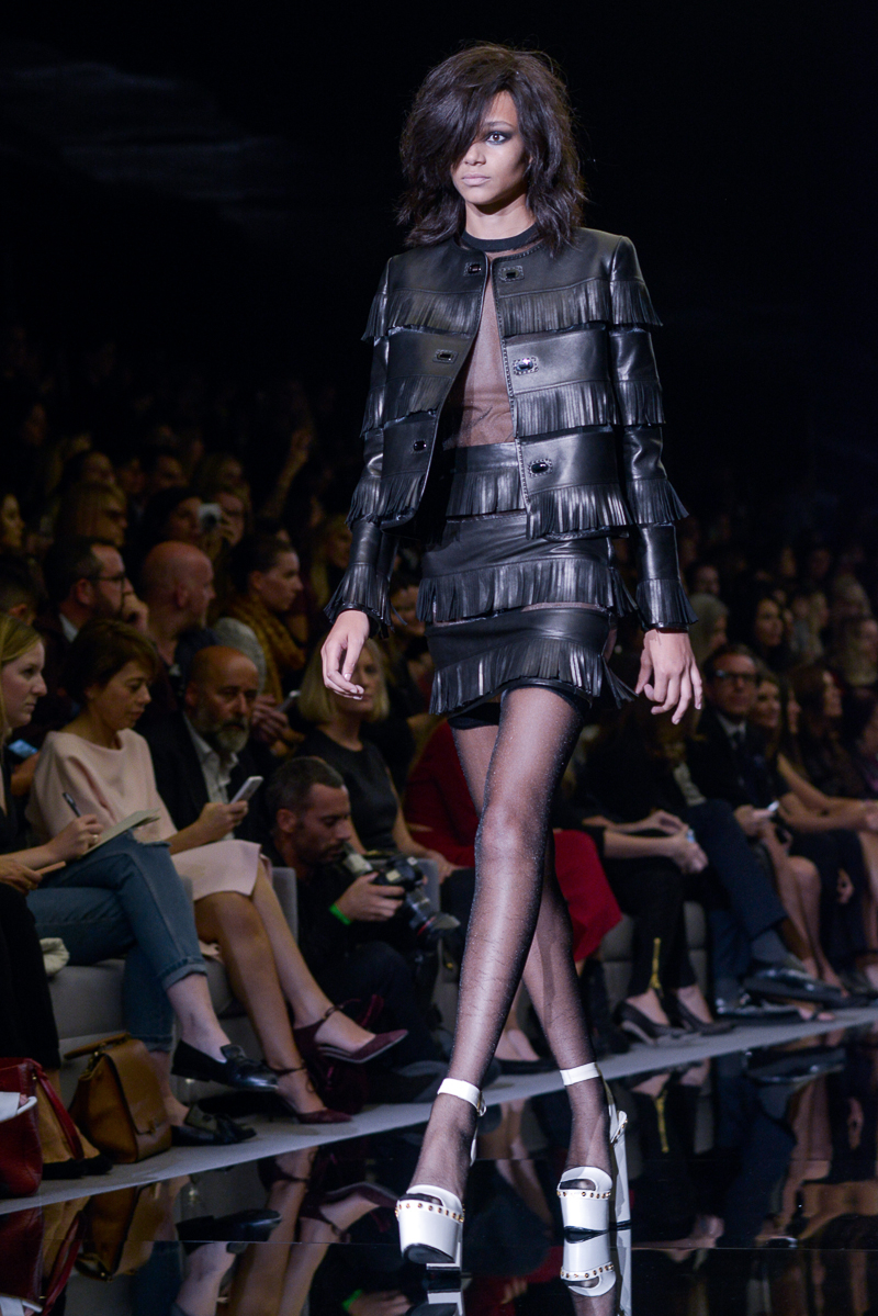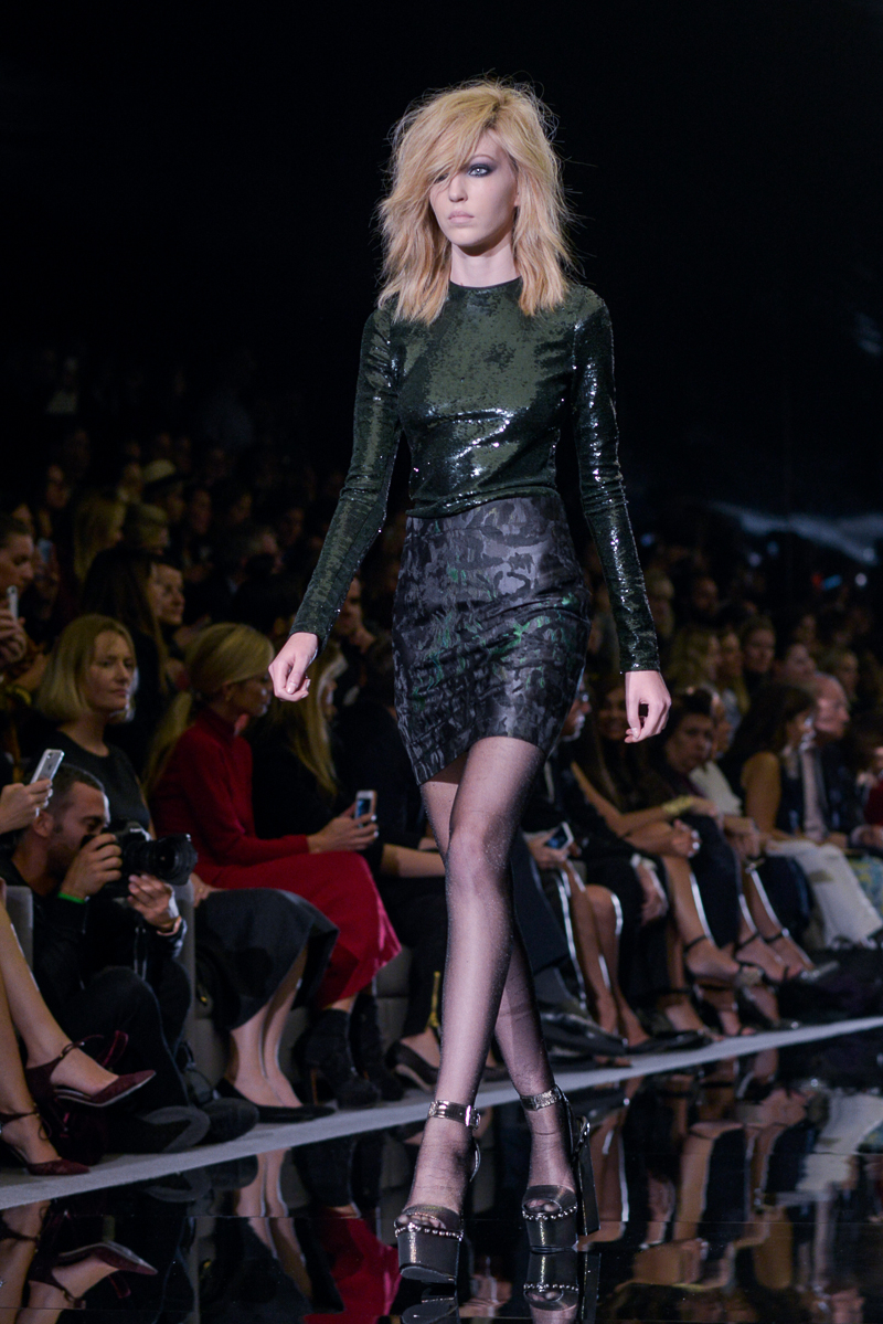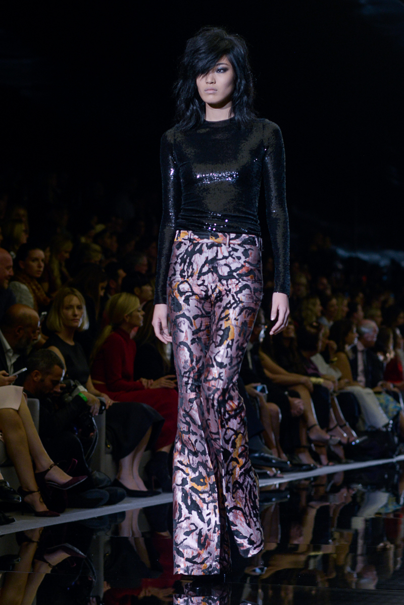Tom Ford presented yet another thrilling, show-stopping and provocative spring/summer 2015 collection at Vincent Square for the London Fashion Week. The new looks consisted of trouser flares made from suede and leather, sequin filled garments, leopard print, and sheer fabrics with black bold panelling.