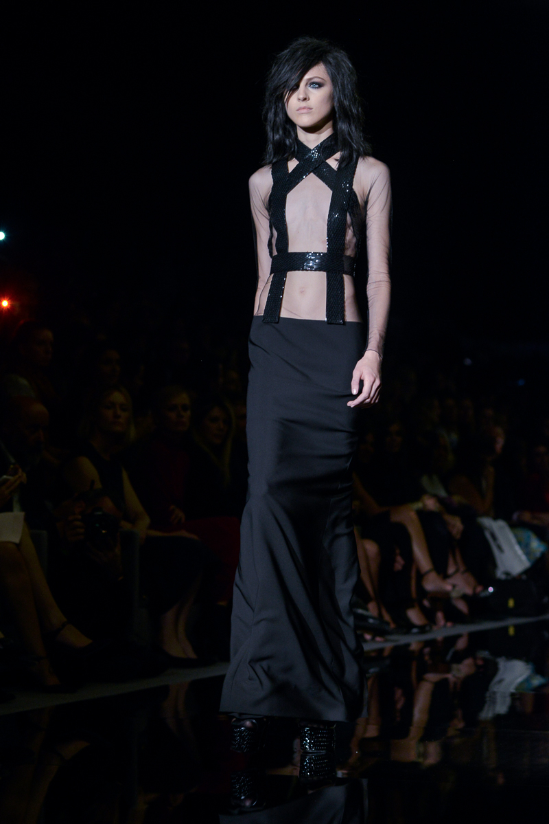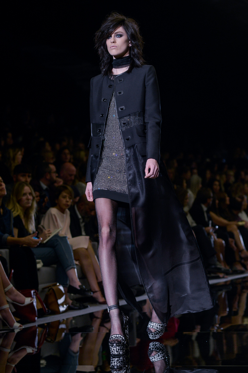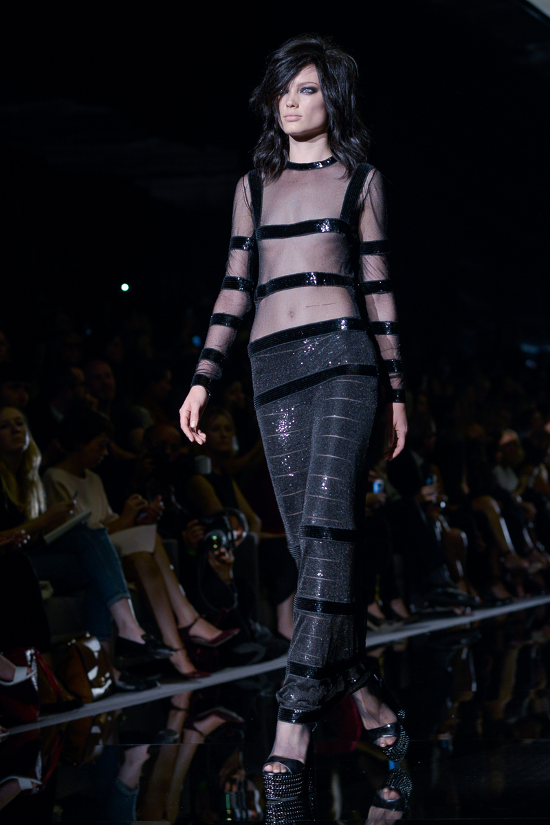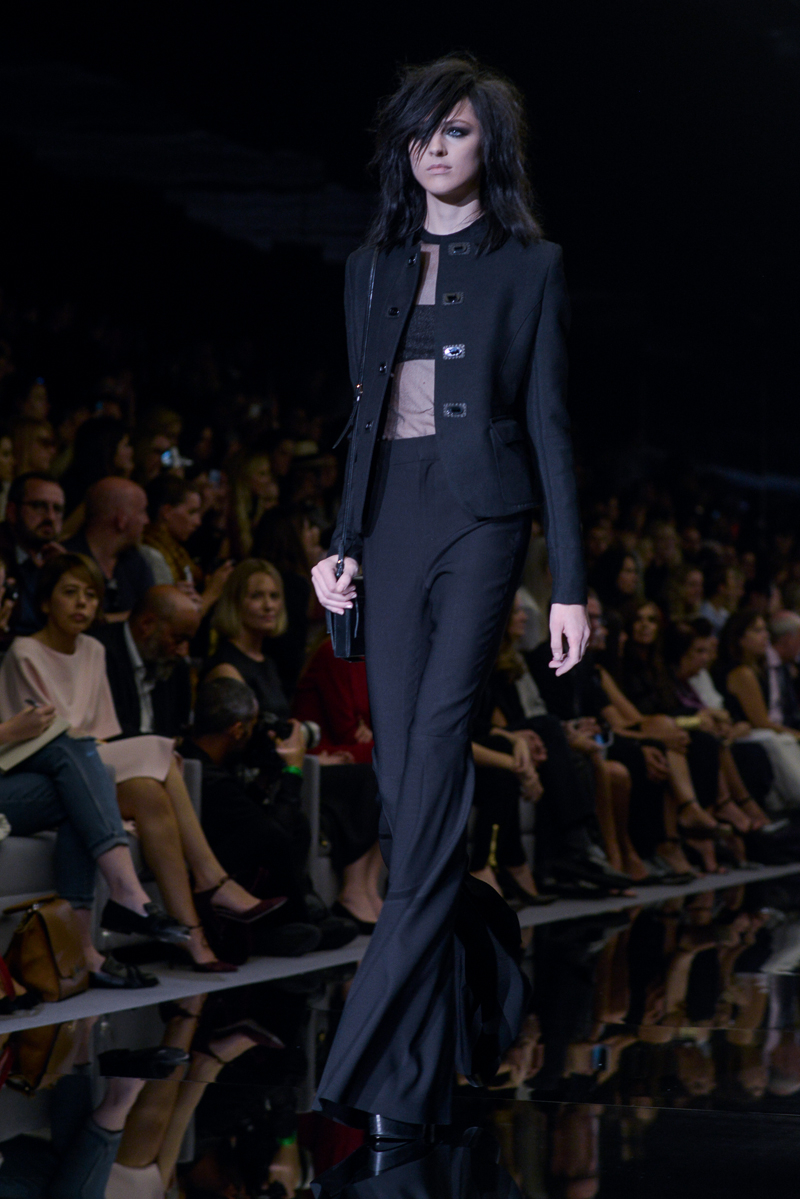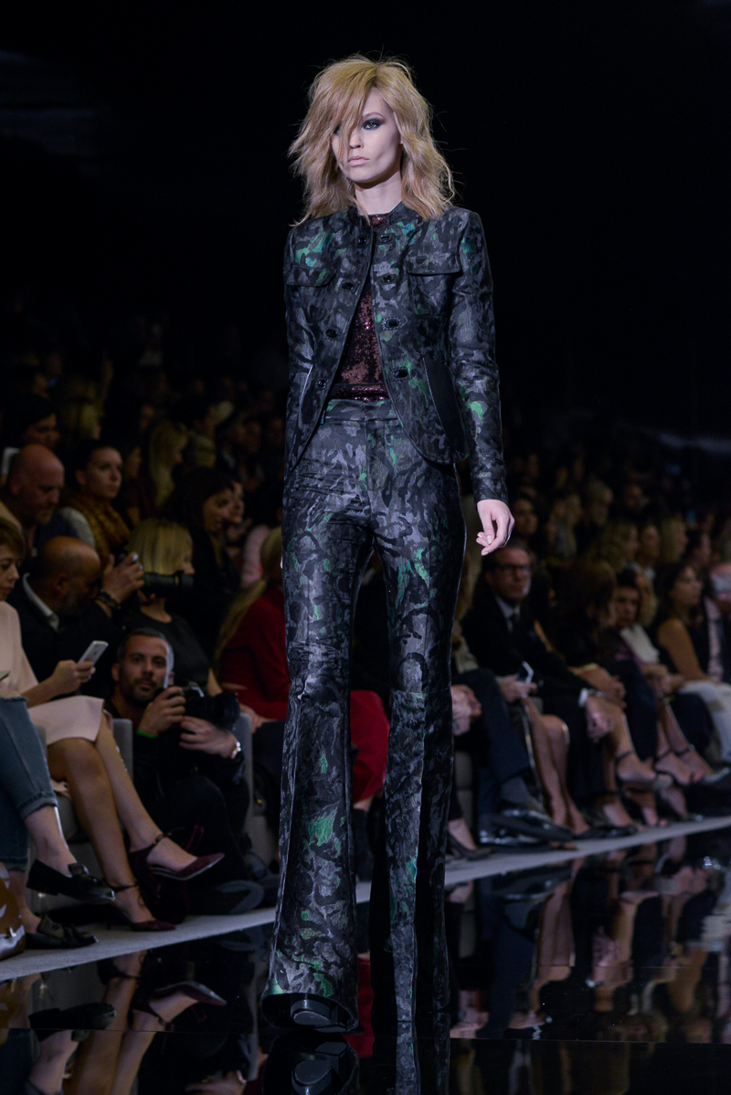 Tom Ford presented yet another thrilling, show-stopping and provocative spring/summer 2015 collection at Vincent Square for the London Fashion Week. The new looks consisted of trouser flares made from suede and leather, sequin filled garments, leopard print, and sheer fabrics with black bold panelling.
