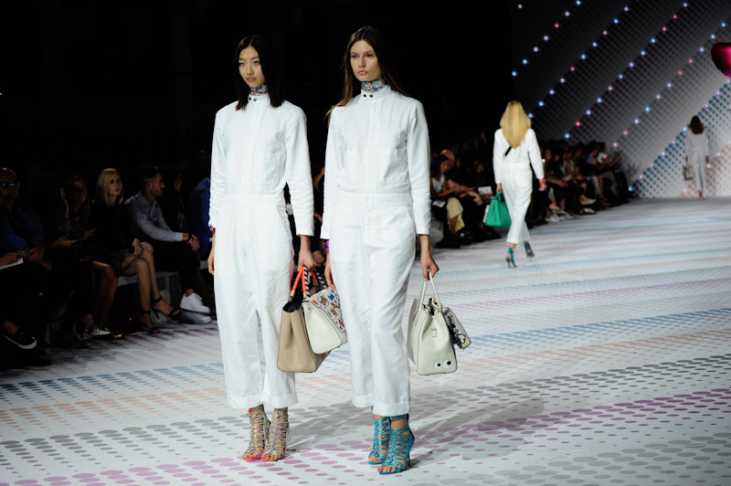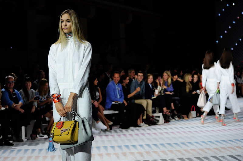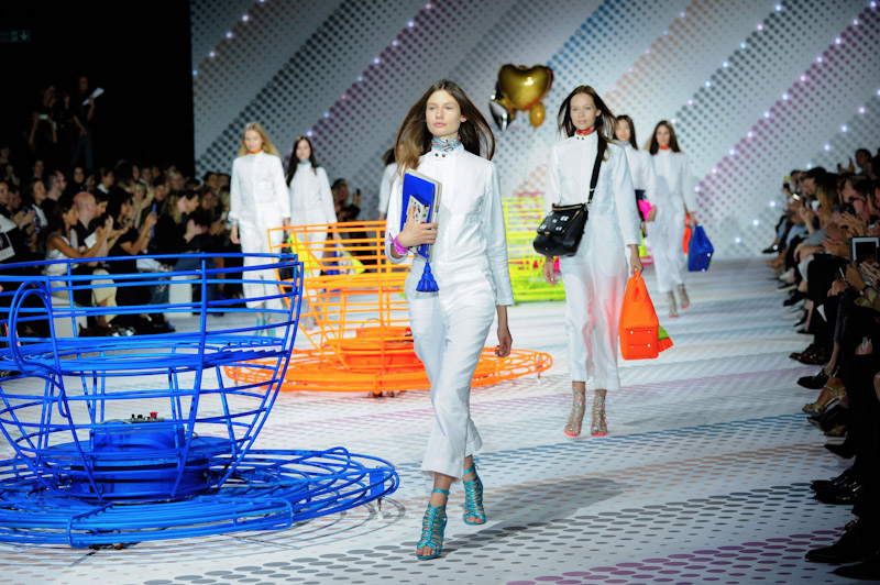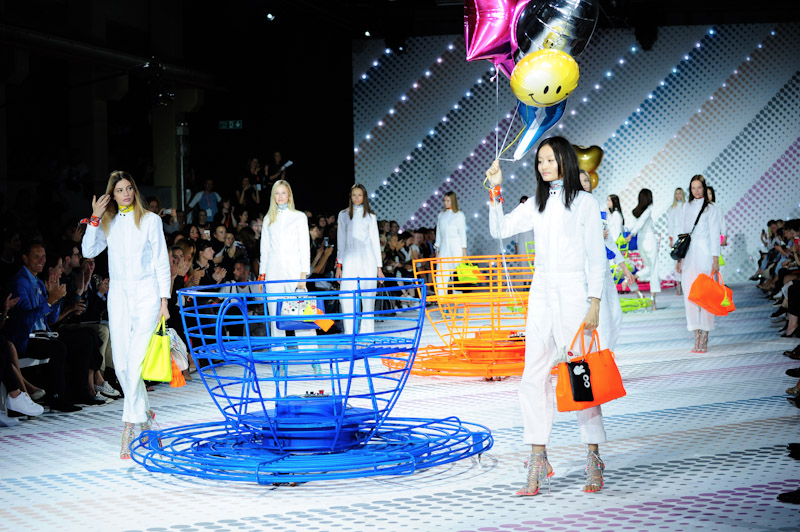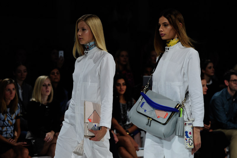 Anya Hindmarch presented a bold, playful spring/summer 2015 collection at the Ambika P3 Gallery for London Fashion Week. The new new season totes were emblazoned with customisable stickers and quirky slogans. Here are our images from the show.