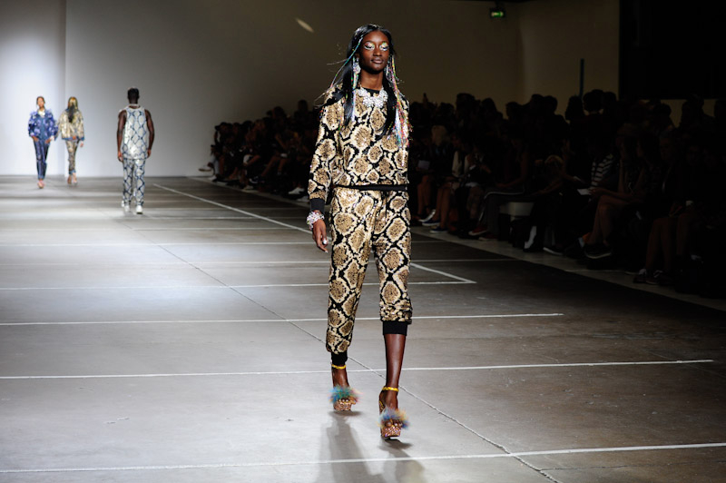 It was party time on the catwalk for the males too, as they showcased an array of sequined joggers and snakeskin shorts, paired with matching trainers and completed with statement metal necklaces.