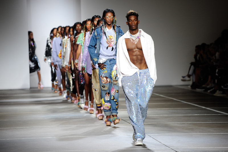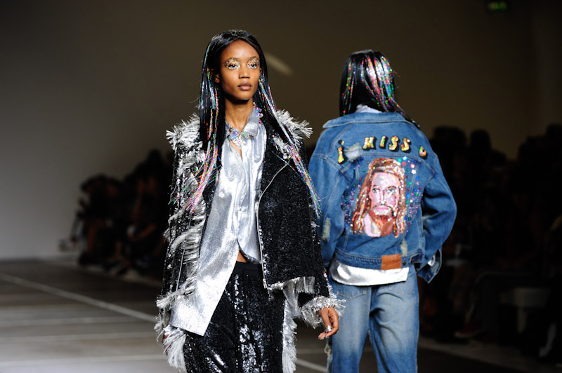 The London-based designer pulled out all the shimmer and shine stops, creating a hypnotic haze of sequins, flamboyant ruffled denim and tongue-in-cheek logos, each taking full command of the runway.