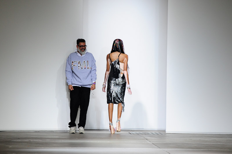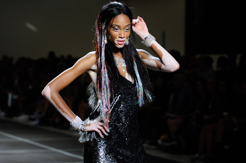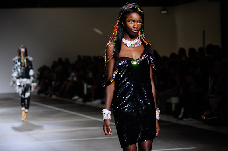 Rainbow-hued sequins smothered co-ordinates and feather, embellished platforms put yet a further sparkle in the Ashish girl’s step. Winnie Harlow led a trail of little dresses that were anything but conservative: slinky, shiny and encrusted with gems. Silver metallic shirts were worn under oversized ripped overalls, whose strands unfurled into full fringes, whilst baggy back-to-front jeans also made an appearance.