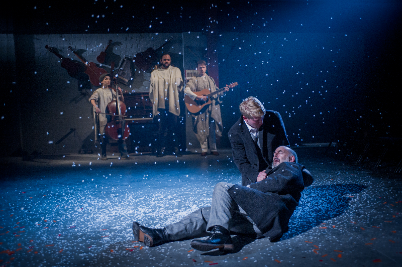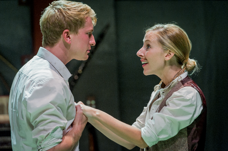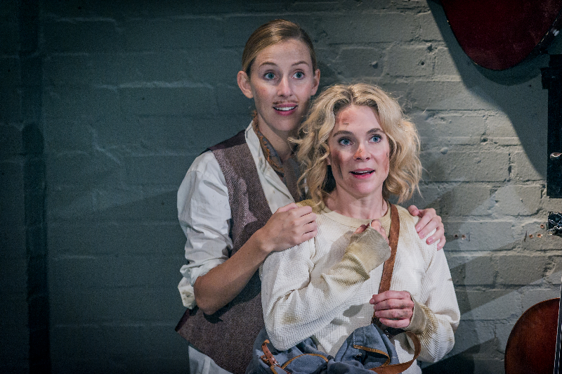 The voices of Joanna Hickman, Minal Patel and Townsend blend beautifully in the folky harmonies of Jude Obermüller’s contemporary score. In a pub-like set up at the back of the stage, a minimal but effective musical source played by members of the cast, the music is artfully interwoven to enhance the emotive points in the plot. The design is equally minimal yet somehow in colouring the air with confetti designer Emma Bailey changes scene and weather. Costumes are a mixture of 1940s smart casual and land-girl country wear, which again adds another layer of modern but-not-quite-now style to the show as a whole.