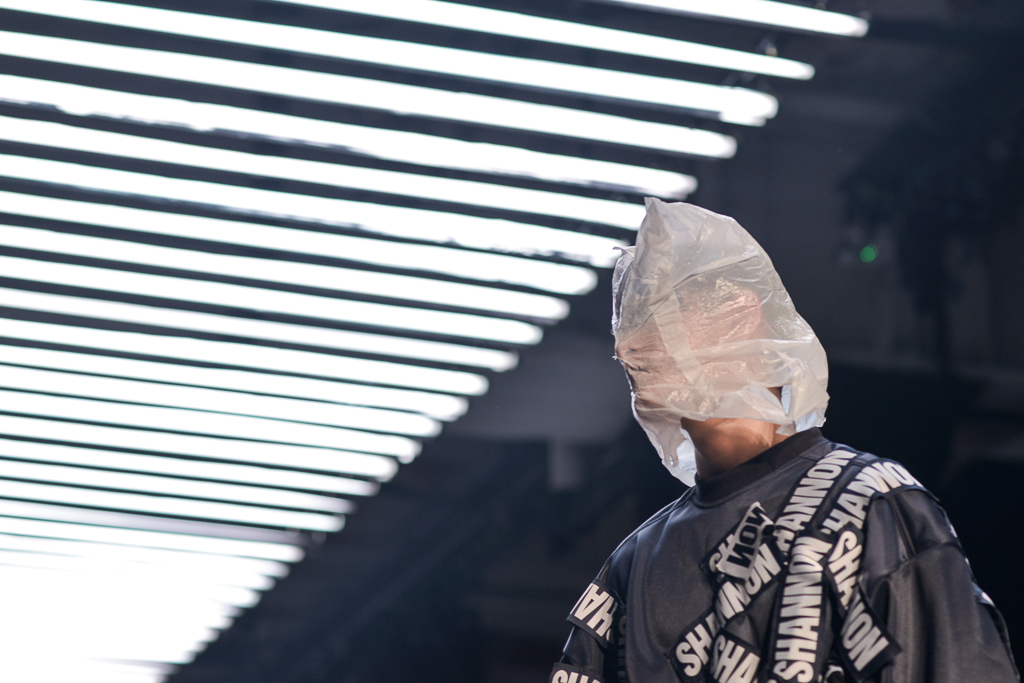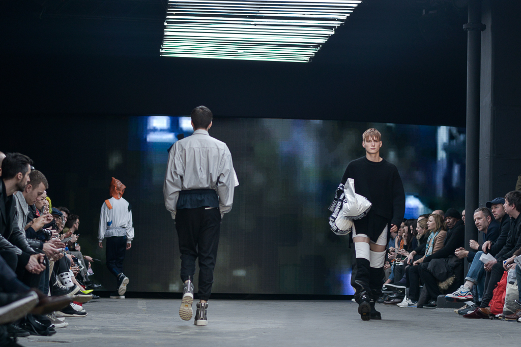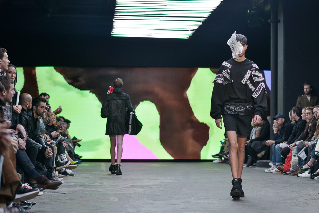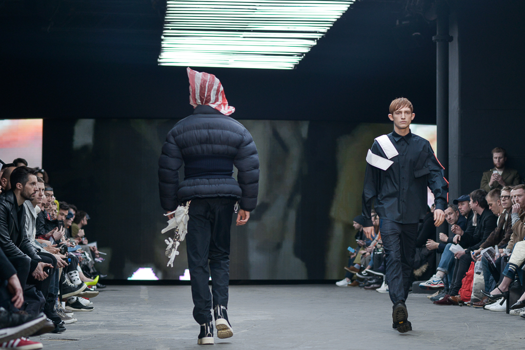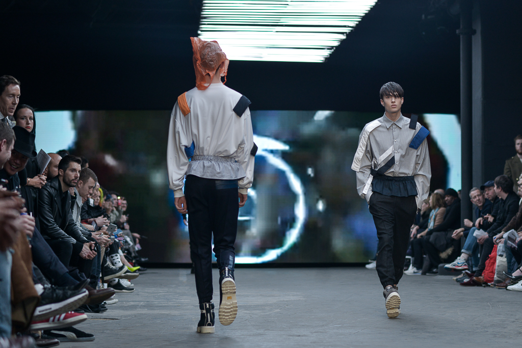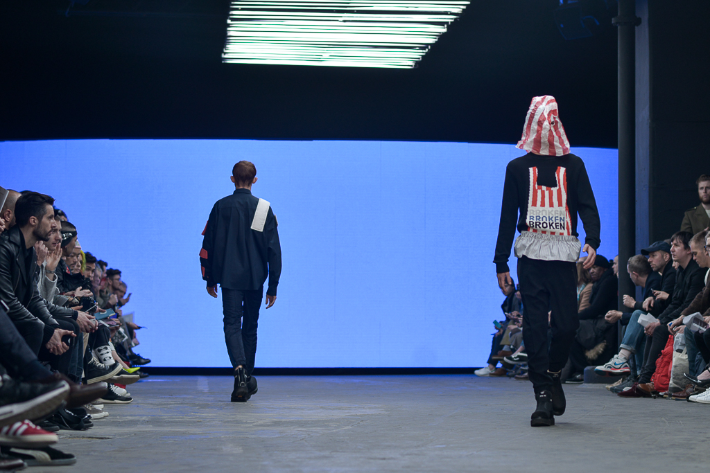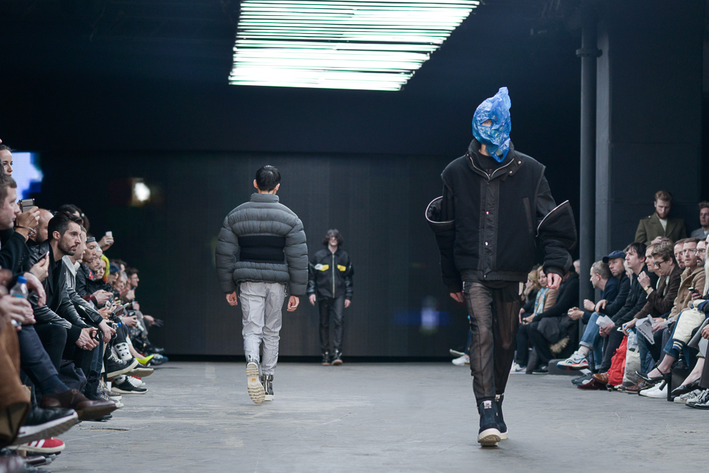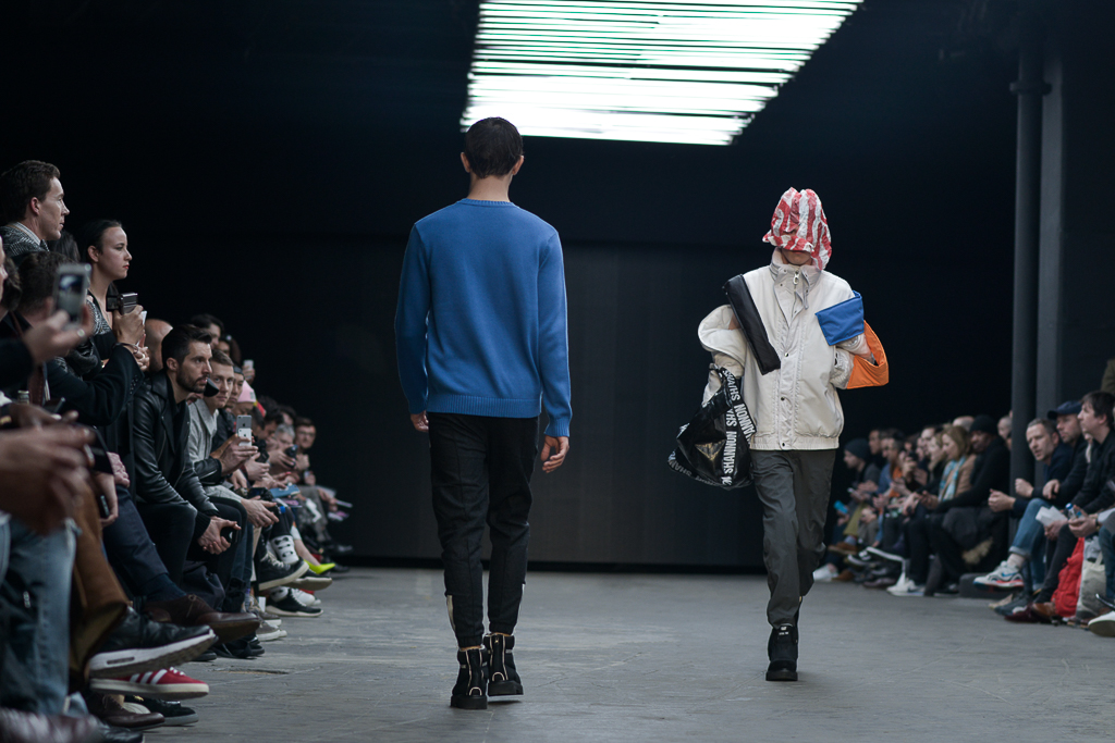 Christopher Shannon presented a political autumn/winter 2015 collection at The Old Sorting Office for the London Collections: Men. The new looks are filled with plastic masks (careful you don’t inhale too much, kids!), gracefully torn trousers, and puffa coats seemingly inspired by feminine waist cinchers . Here are our images from the show.