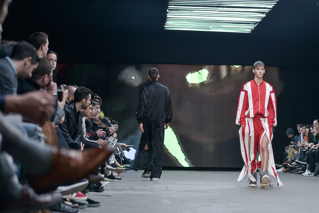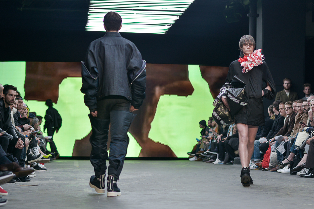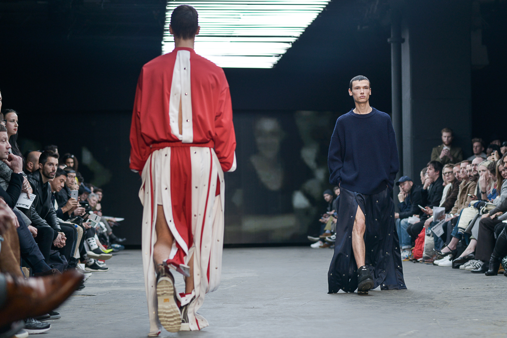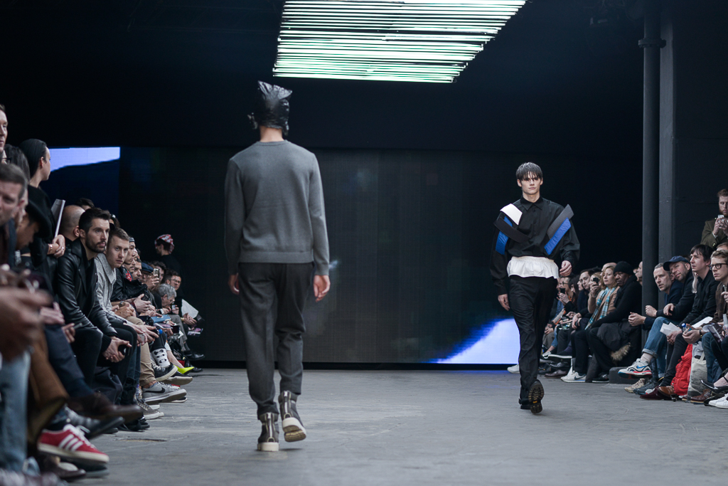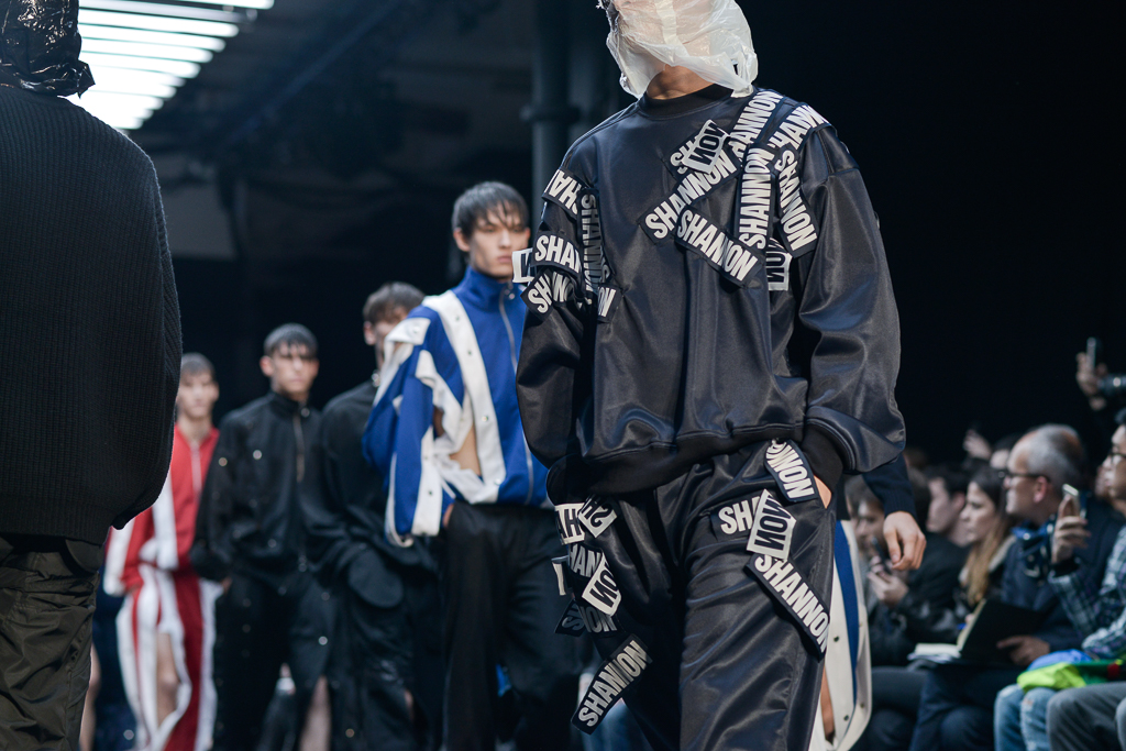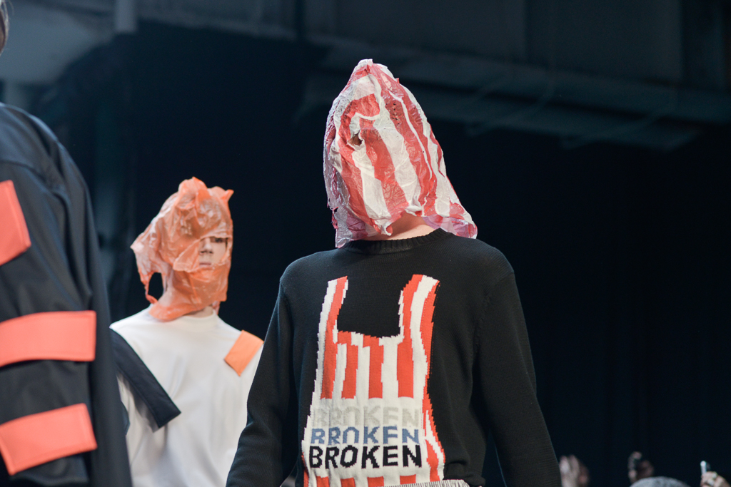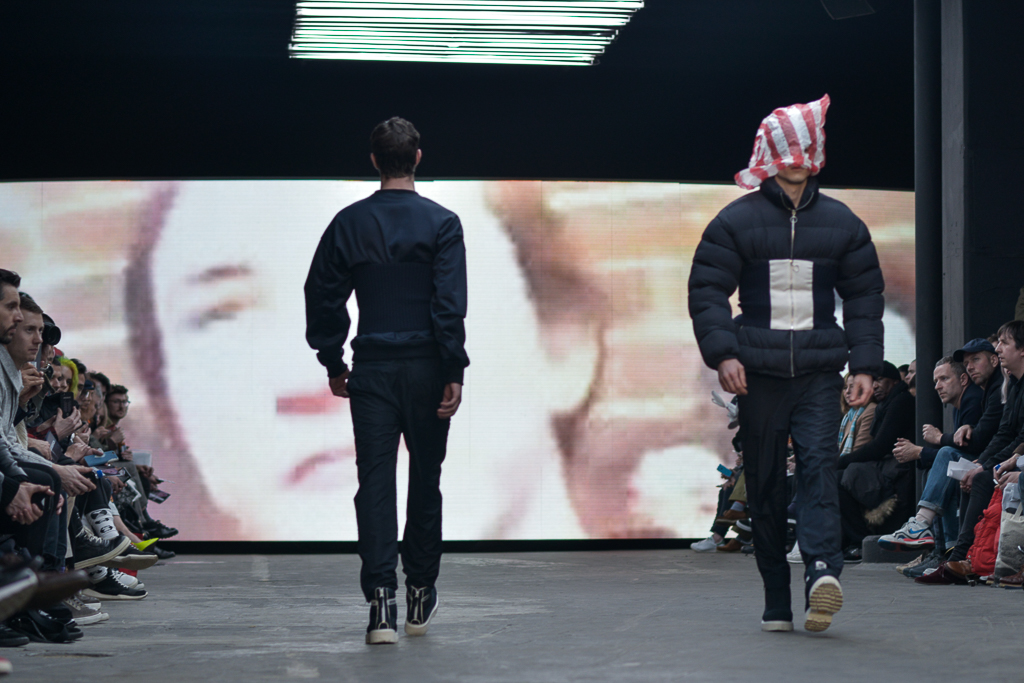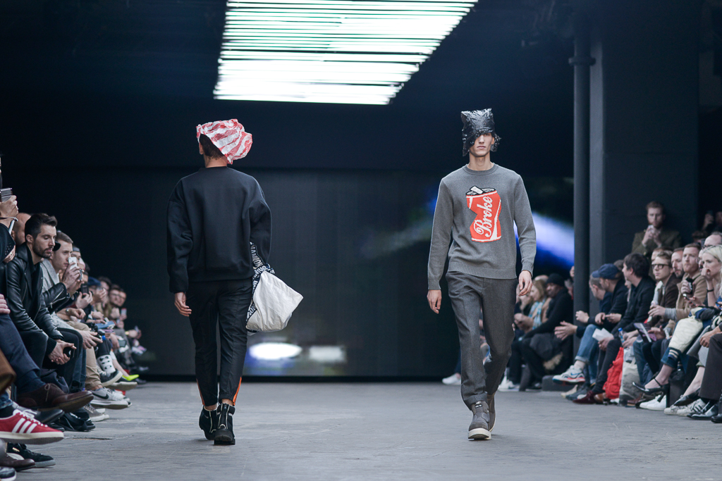 Christopher Shannon presented a political autumn/winter 2015 collection at The Old Sorting Office for the London Collections: Men. The new looks are filled with plastic masks (careful you don’t inhale too much, kids!), gracefully torn trousers, and puffa coats seemingly inspired by feminine waist cinchers . Here are our images from the show.