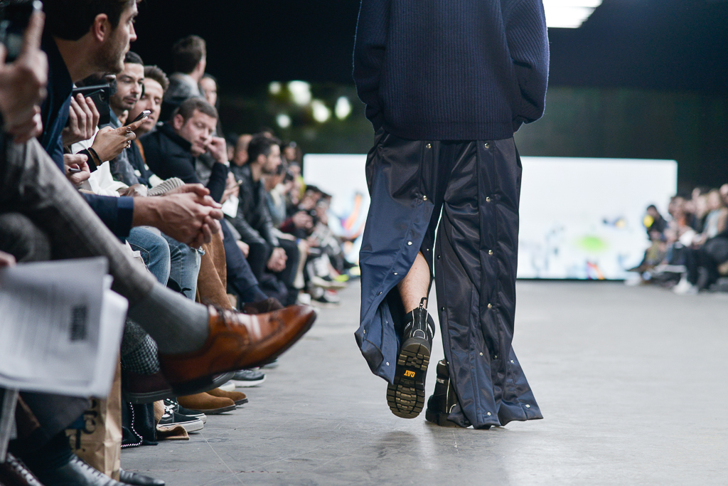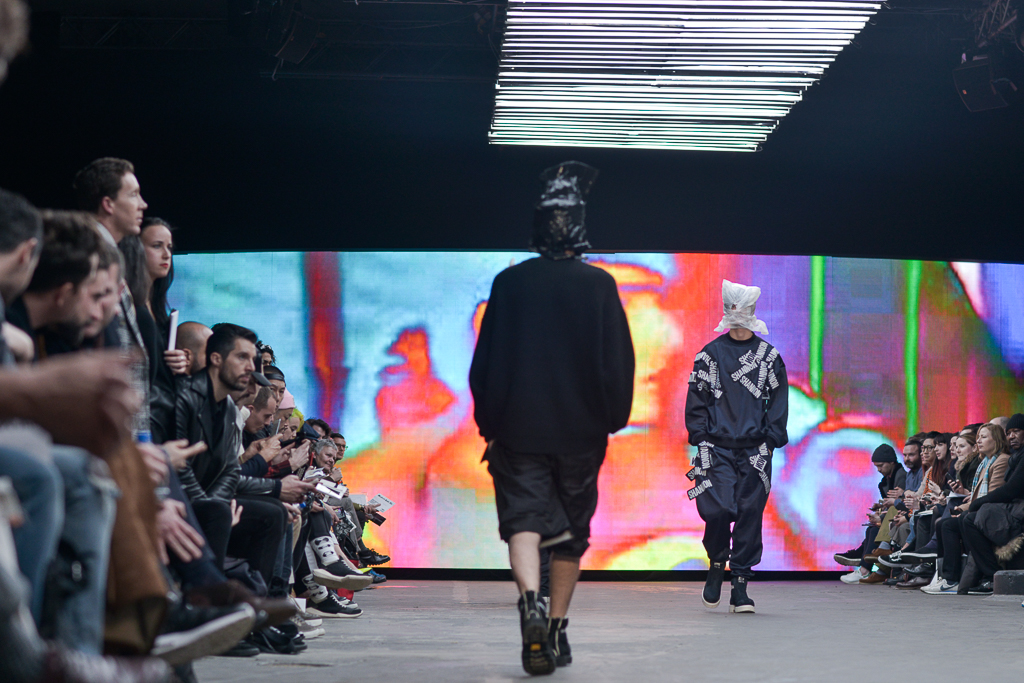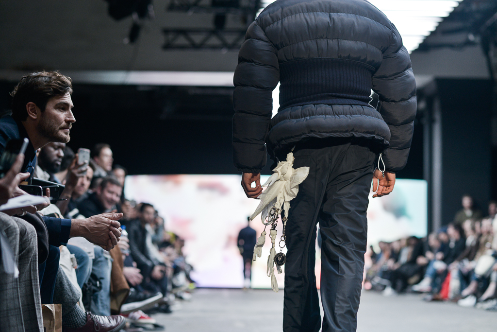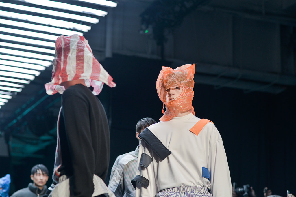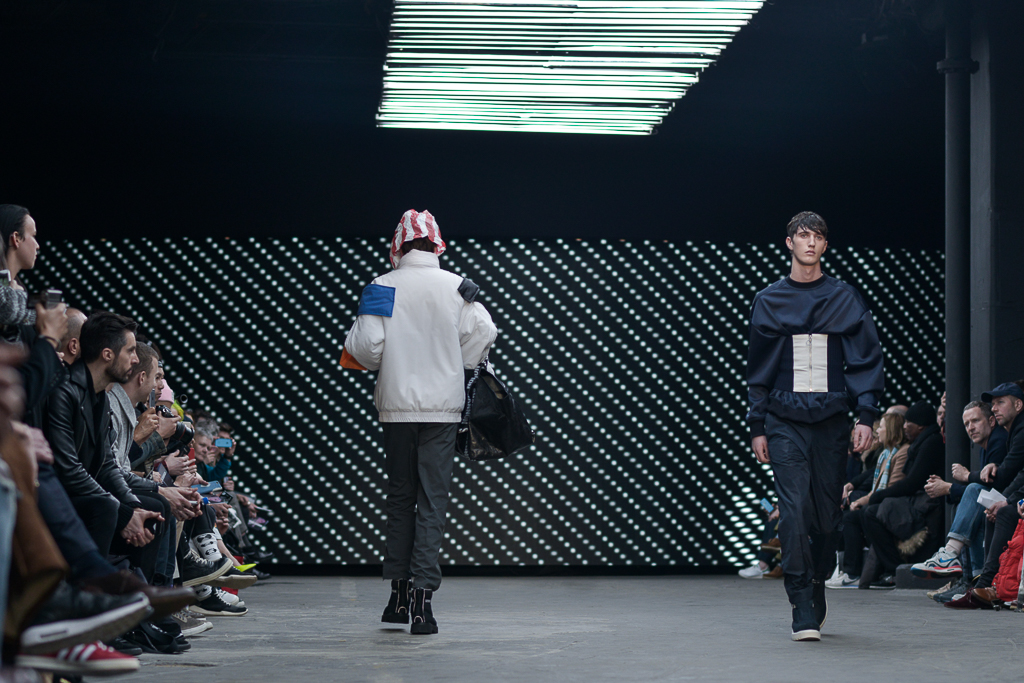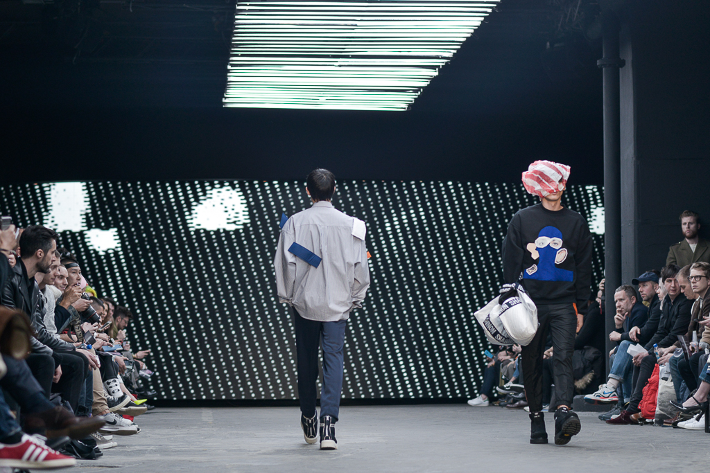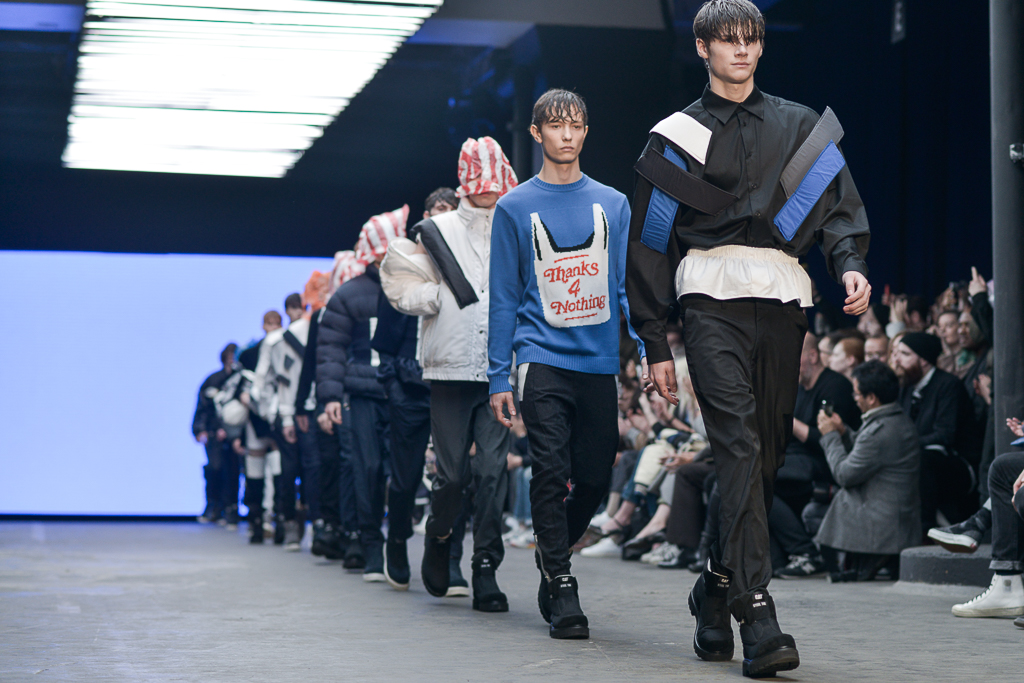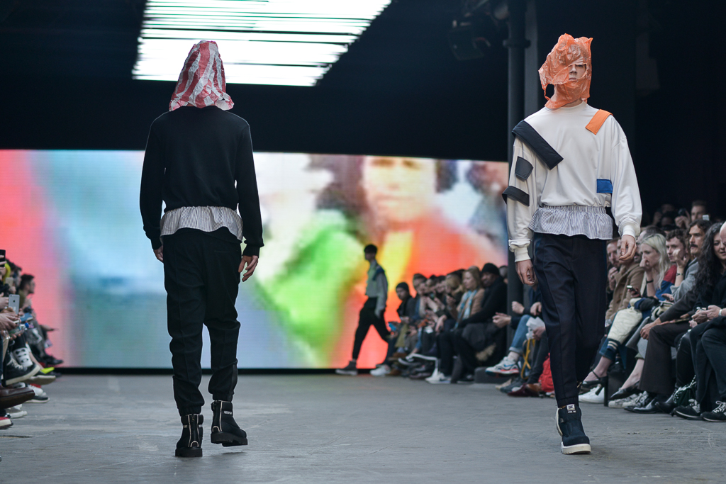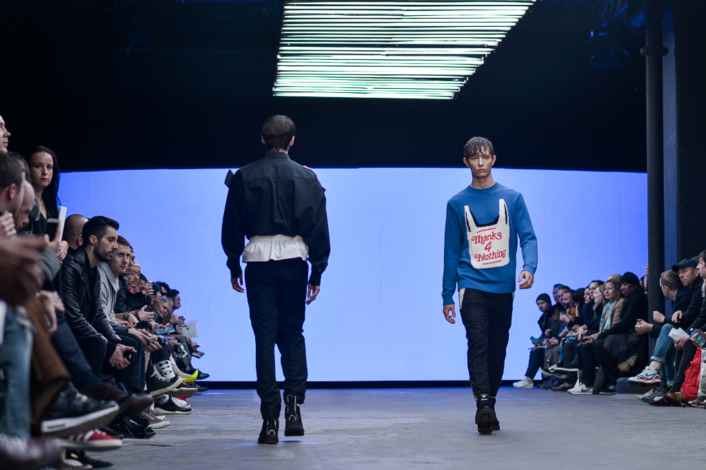 Christopher Shannon presented a political autumn/winter 2015 collection at The Old Sorting Office for the London Collections: Men. The new looks are filled with plastic masks (careful you don’t inhale too much, kids!), gracefully torn trousers, and puffa coats seemingly inspired by feminine waist cinchers . Here are our images from the show.