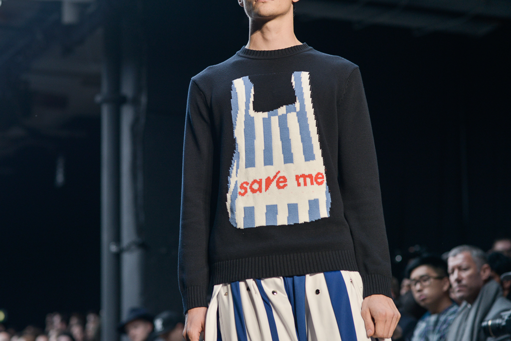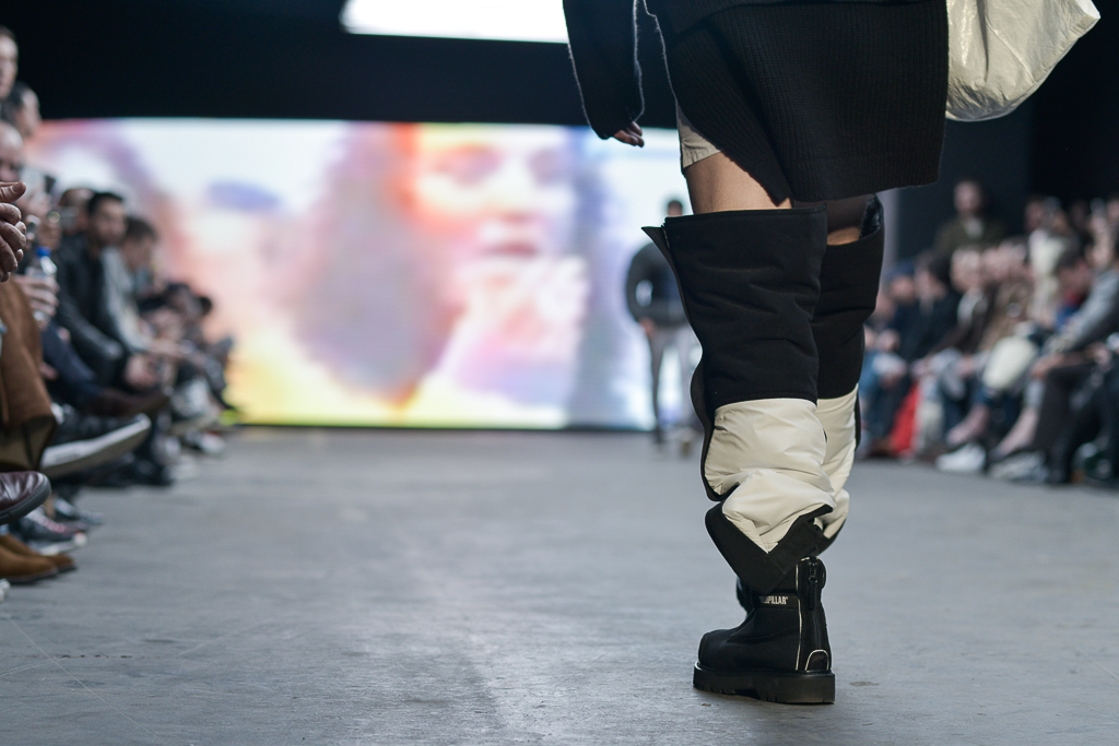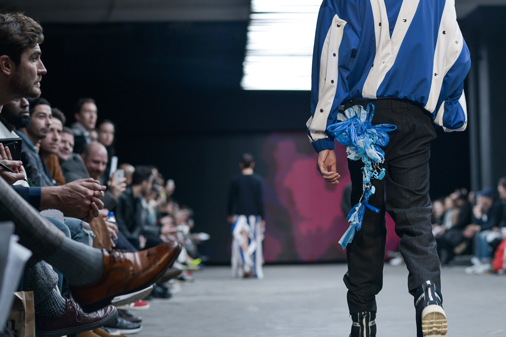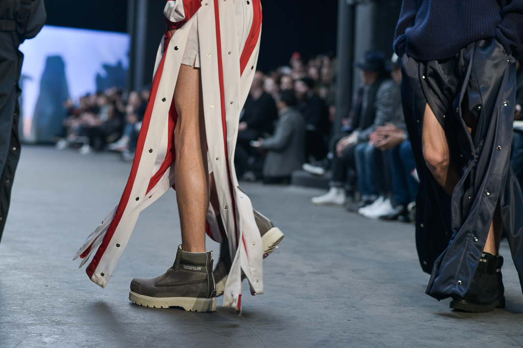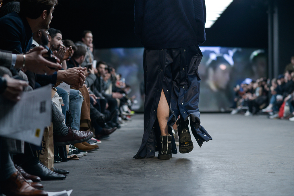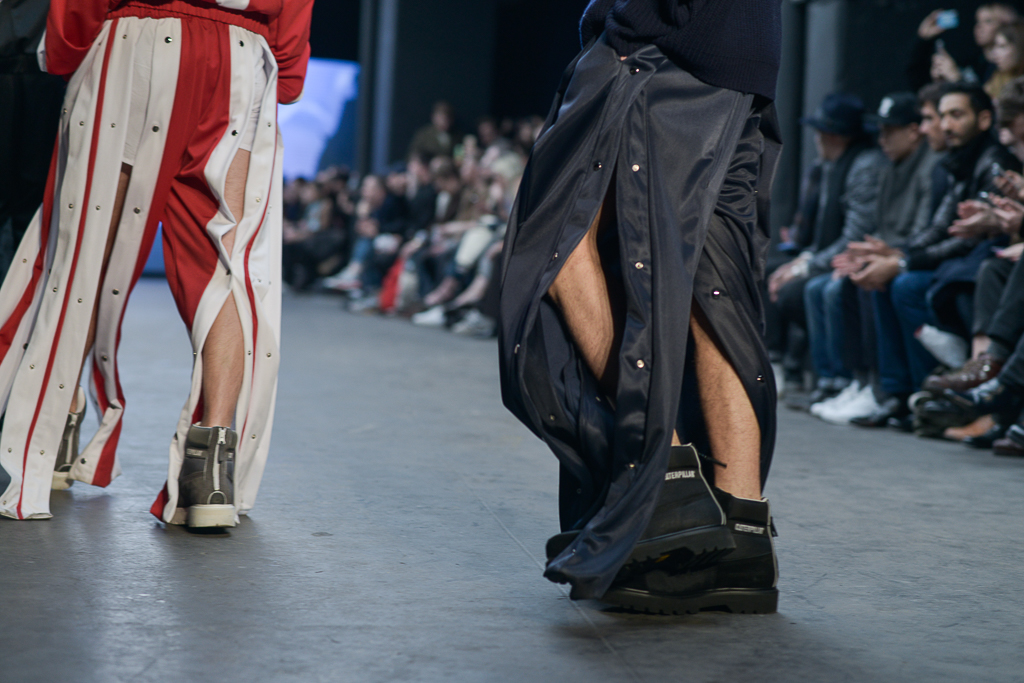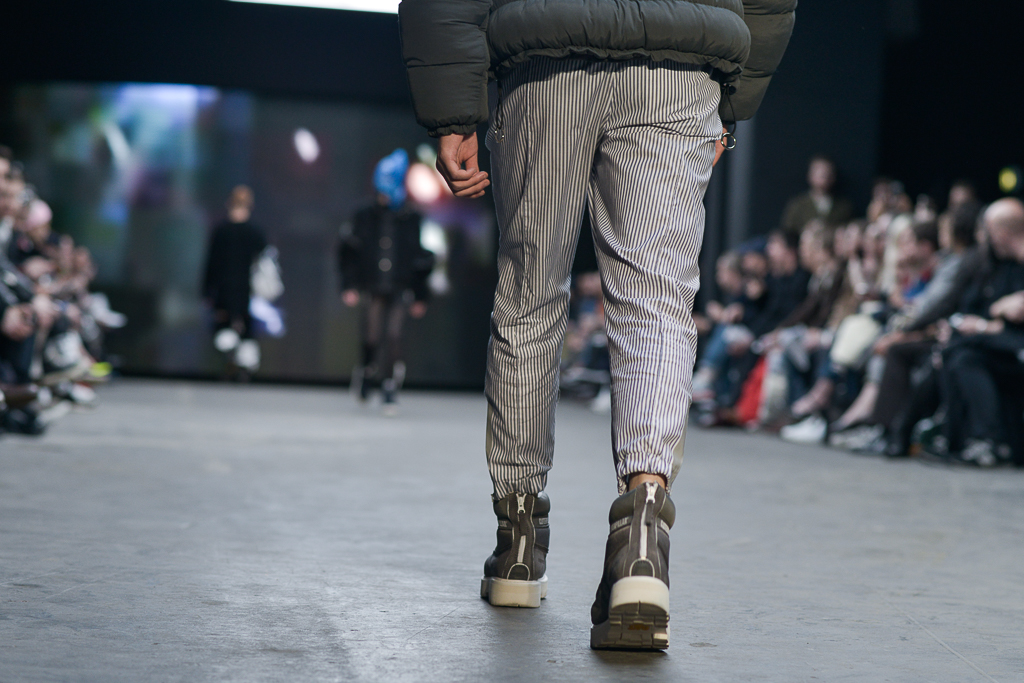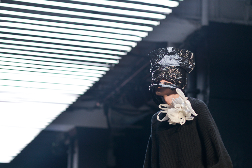 Christopher Shannon presented a political autumn/winter 2015 collection at The Old Sorting Office for the London Collections: Men. The new looks are filled with plastic masks (careful you don’t inhale too much, kids!), gracefully torn trousers, and puffa coats seemingly inspired by feminine waist cinchers . Here are our images from the show.