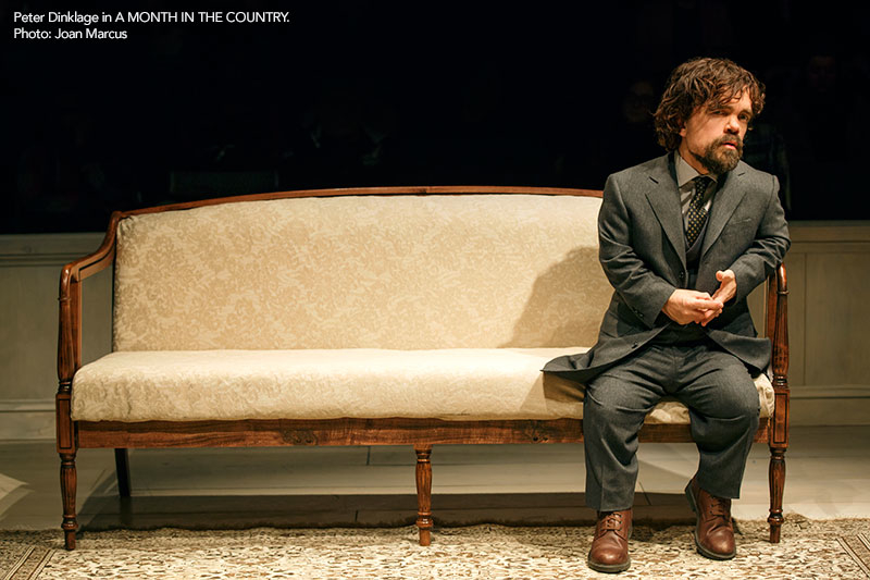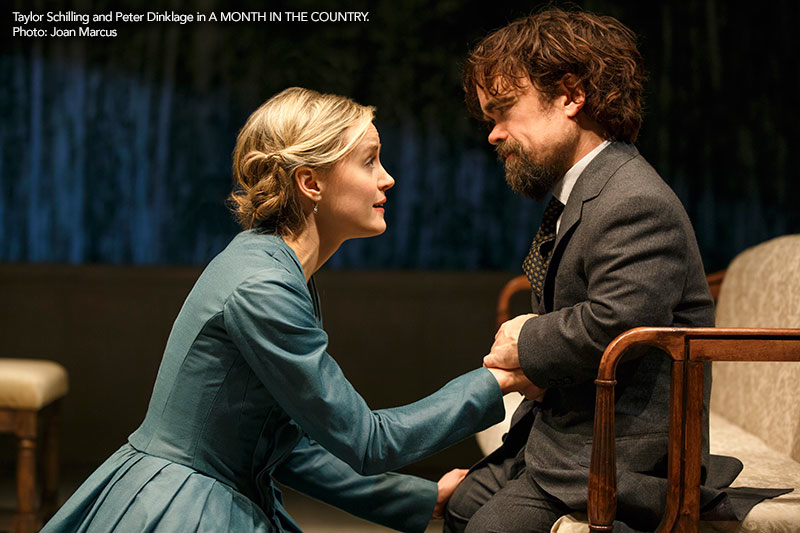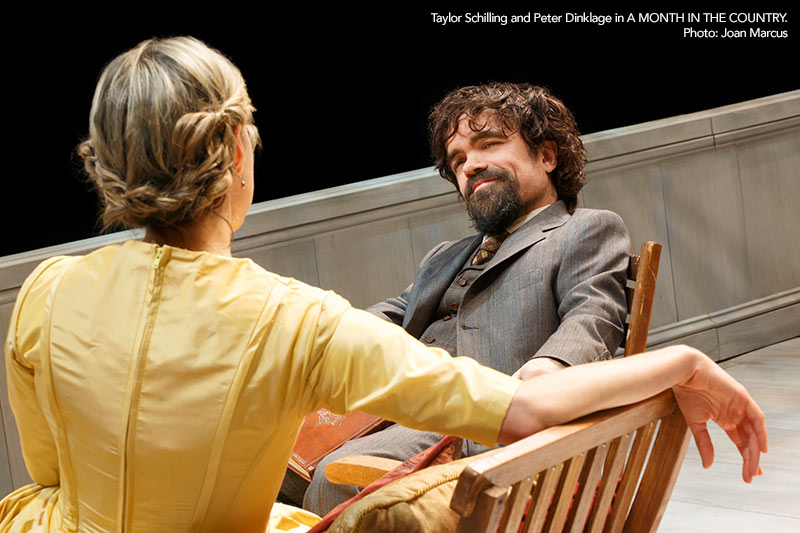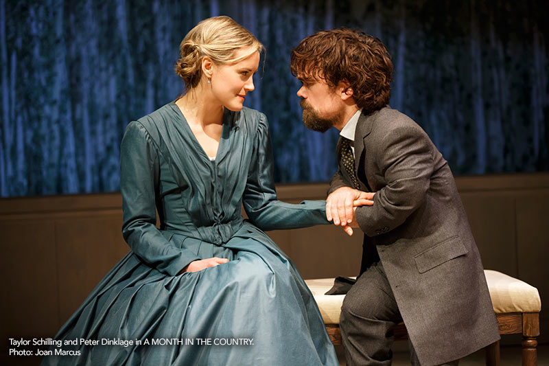 The timing of Classic Stage Company’s casting of the two leads in Ivan Turgenev’s A Month in the Country could not be better. Taylor Schilling, recent recipient of a Screen Actors Guild Award (along with her fellow Orange is the New Black inmates) plays Natalya, the conflicted heroine and Peter Dinklage, the most charming and dangerous member of Game of Thrones’ Lannister clan, is Mikhail, the neighbor who loves her. The two are talented, have stage presence and chemistry – it would be interesting seeing the two in Miss Julie – but it is only when they interact that the play comes alive.