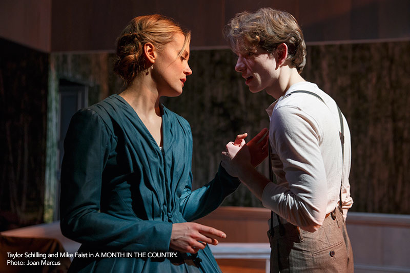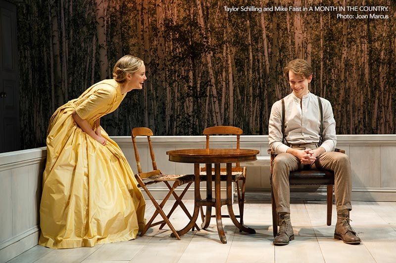 The problem is the play itself. Occasionally, CSC uses a modernized translation to make a production trendy (a disservice they have repeatedly done to Molière); Christopher Jones’ translation is unembellished and clear. Natalya is restless from inactivity, something which should be brimming with dramatic possibilities. However, Turgenev keeps her a one-dimensional hysteric, never exploring the social or psychological reasons behind her behavior as other writers did in their work in 1872 (when adapting his 1855 novel for the stage). To her credit, Schilling does everything possible to flesh her out and never seeks the audience’s sympathy. Mikhail knows her well enough and accepts her moodiness, which reaches its peak with the hiring of Aleksay (Mike Faist) to tutor her son Koyla (Ian Etheridge) for…a month in the country. She falls in love with the 21-year-old, as does teenage foster daughter Vera (Megan West), yet the resulting situation has neither tension nor passion.